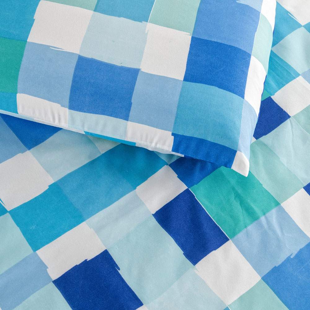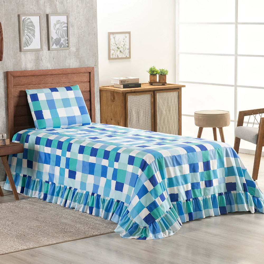 Kit Cobre Leito Colcha Turin Solteiro Estampada c/ Babado 400 Fios 2 Peças Xadrez Quadriculado Azul