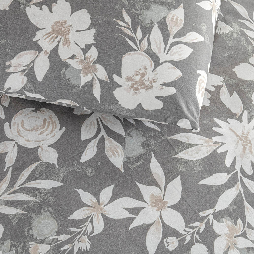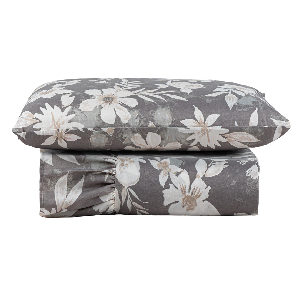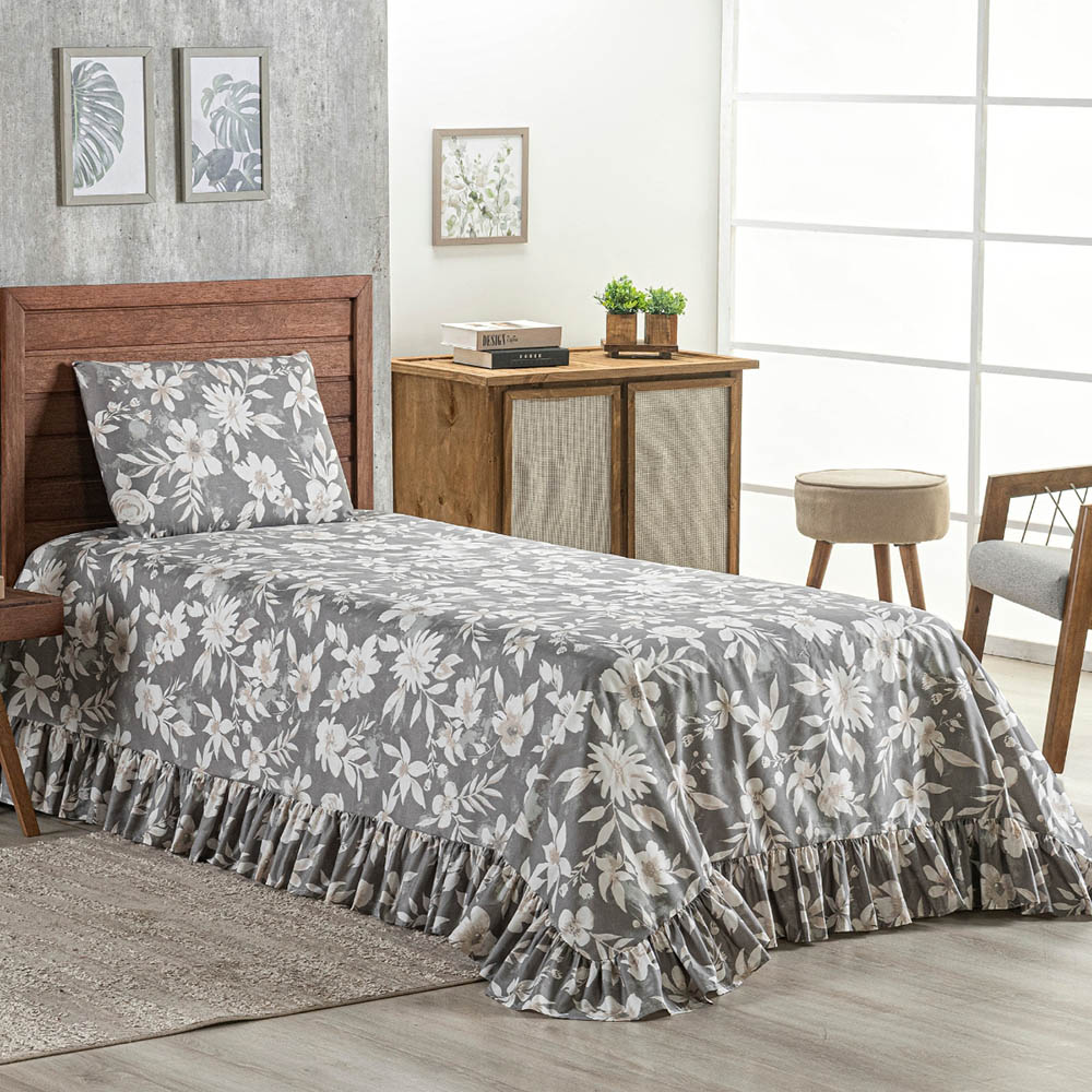 Kit Cobre Leito Colcha Turin Solteiro Estampada c/ Babado 400 Fios 2 Peças Florido Flores Cinza