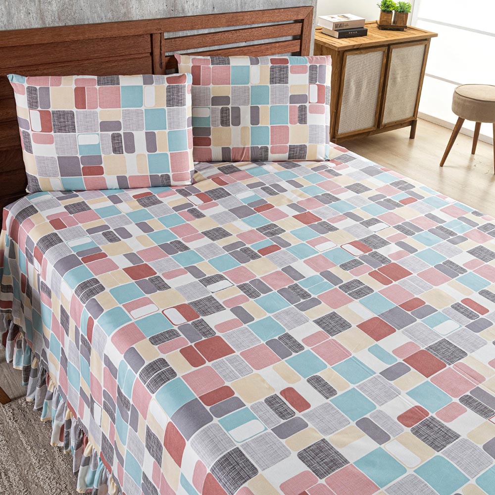 Kit Cobre Leito Colcha Turin Casal Estampada c/ Babado 400 Fios 3 Peças Pastilhas Coloridas Rosê