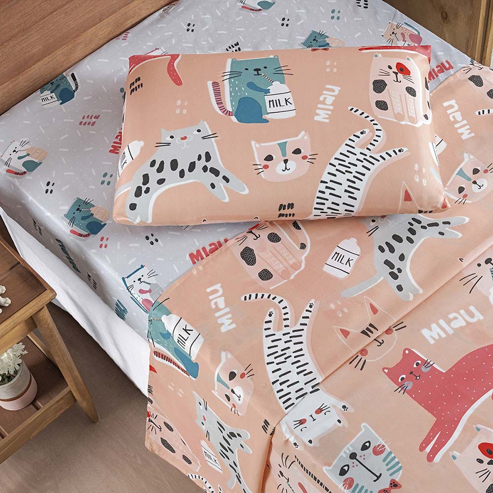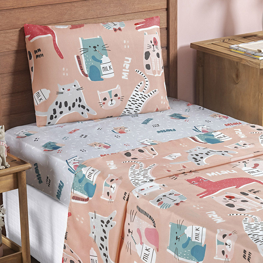 Jogo Cama Lençol Fantasy Solteiro Cama Quarto Infantil Microfibra 3 Peças Gatinha Rosê
