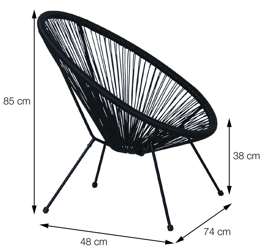 DESCRIÇÃO TÉCNICAMaterial: Pvc e MetalAcabamento: Cordas em PVCDimensões (LxPxA) : 73 x 65 x 85cmAltura do Assento: 37 cmPeso: 7 KgPeso Máximo Suportado: 120 KgINFORMAÇÕES DO PRODUTOPoltrona Acapulco febre na década de 50 no México, ficavam em calçadas das casas e bares e restaura voltam como destaque na decoração contaporânea,extremamente confortável pode ser utilizada em ambientes internos e externos.Pés em aço maciço, acabamento das cordas em PVC.Você pode decorar vários ambientes como varandas, decks, beira de piscina. Além de uso corporativo em cafes, lounges, bares.