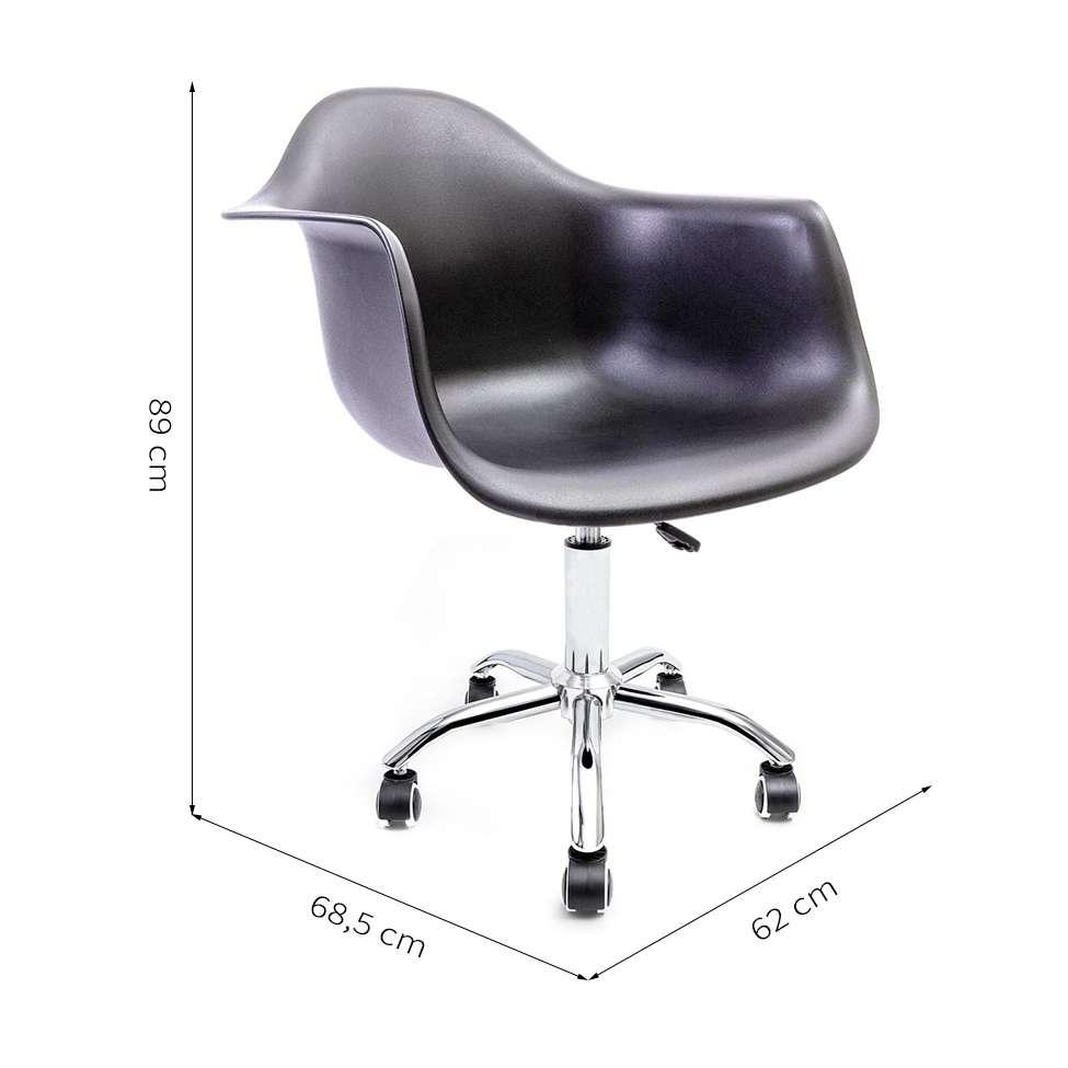 Com altíssima qualidade, nossas Cadeiras Eames foram desenvolvidas com formato ergonômico para melhor adaptação e experiência de nossos consumidores durante todo o dia de trabalho; sua concha é produzida em PP (Polipropileno) garantindo durabilidade e conforto em seu encosto. Os pés são giratórios, proporcionando mobilidade, beleza, charme. Contando com 5 rodízios, garantindo assim, segurança e firmeza para seu produto. A cadeira ainda conta com rodas em polipropileno, garantindo um produto seguro e mantendo a confiabilidade da marca Empório Tiffany.Medidas do produto: Largura: 63cm x Altura: miníma 79cm - máxima: 91cm x Comprimento: 67cm.Cor: PretoQuantidade: 1Garantia: 90 dias a partir da emissão da nota fiscal.