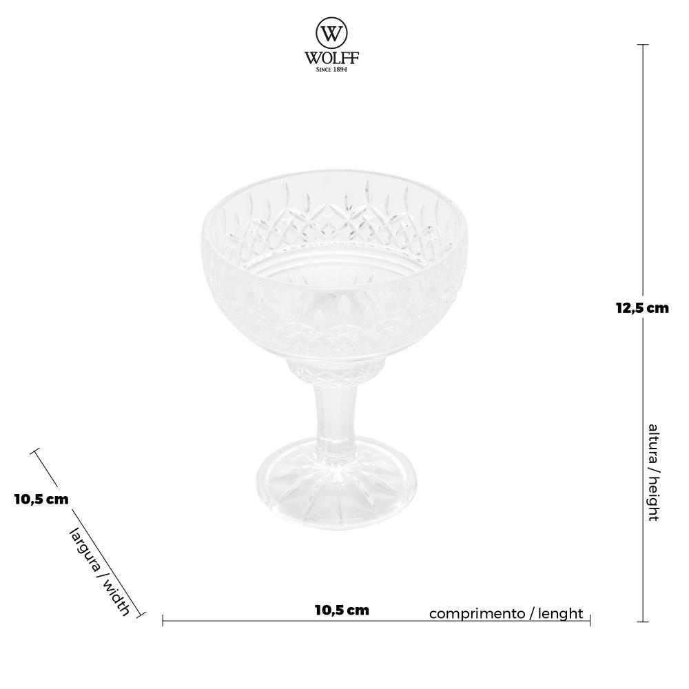 Símbolo de luxo e elegância, a Wolff foi fundada em 1894 na Alemanha. O portfólio divide-se em itens de porcelana e cristal importados com exclusividade e em itens de prata e inox produzidos na fábrica nacional, com mão de obra altamente treinada e especializada.6 Taças Wolff Lys de Cristal 260mlNão importa o estilo que você procura, nossa linha de TAÇAS de sobremesa possui modelos para todos os gostos e ainda sim, não deixam de ser um produto cheio de sofisticação e autenticidade. WOLFF, há mais de um século servindo bons momentos.Material: CRISTALCor : INCOLORMedidas: Capacidade: 260mlPeso do Produto (kg): 2.04Garantia: 90 dias