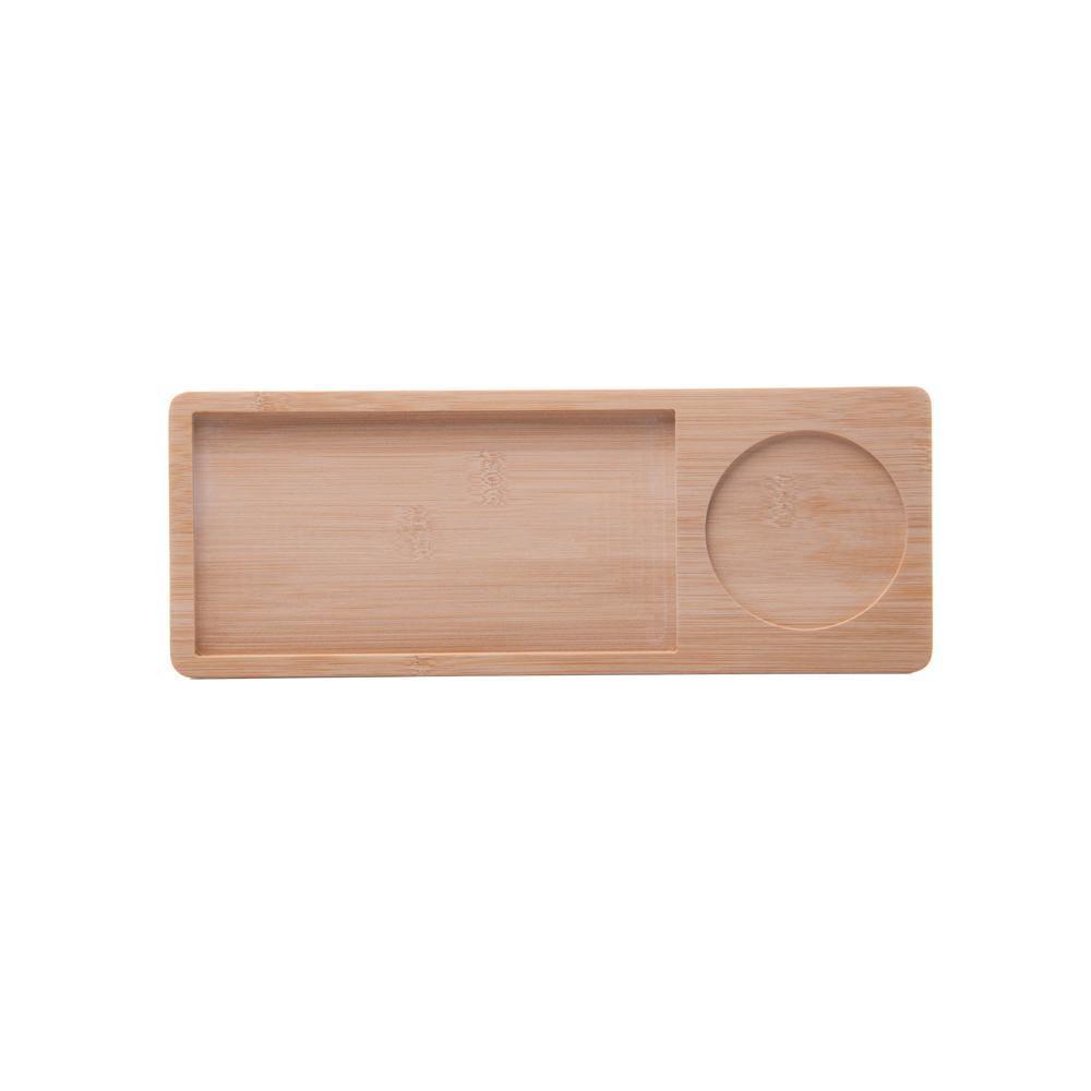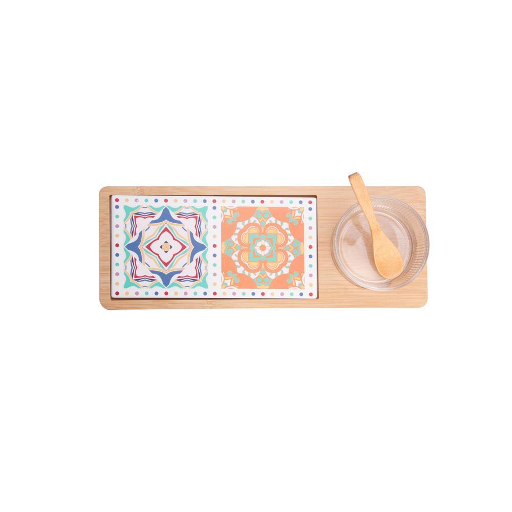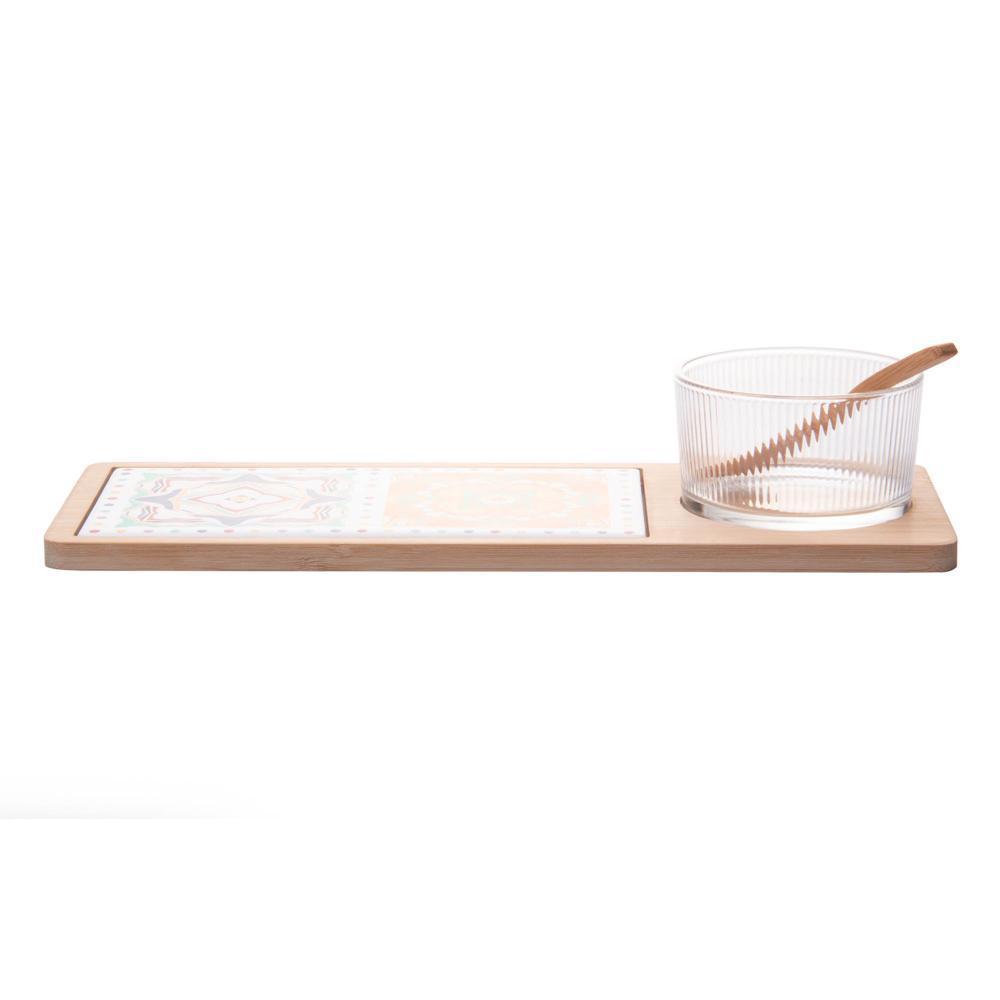 Petisqueira De Vidro com Bandeja de Bambu e Ladrilho 32cm x 12cm x 5,5Cm