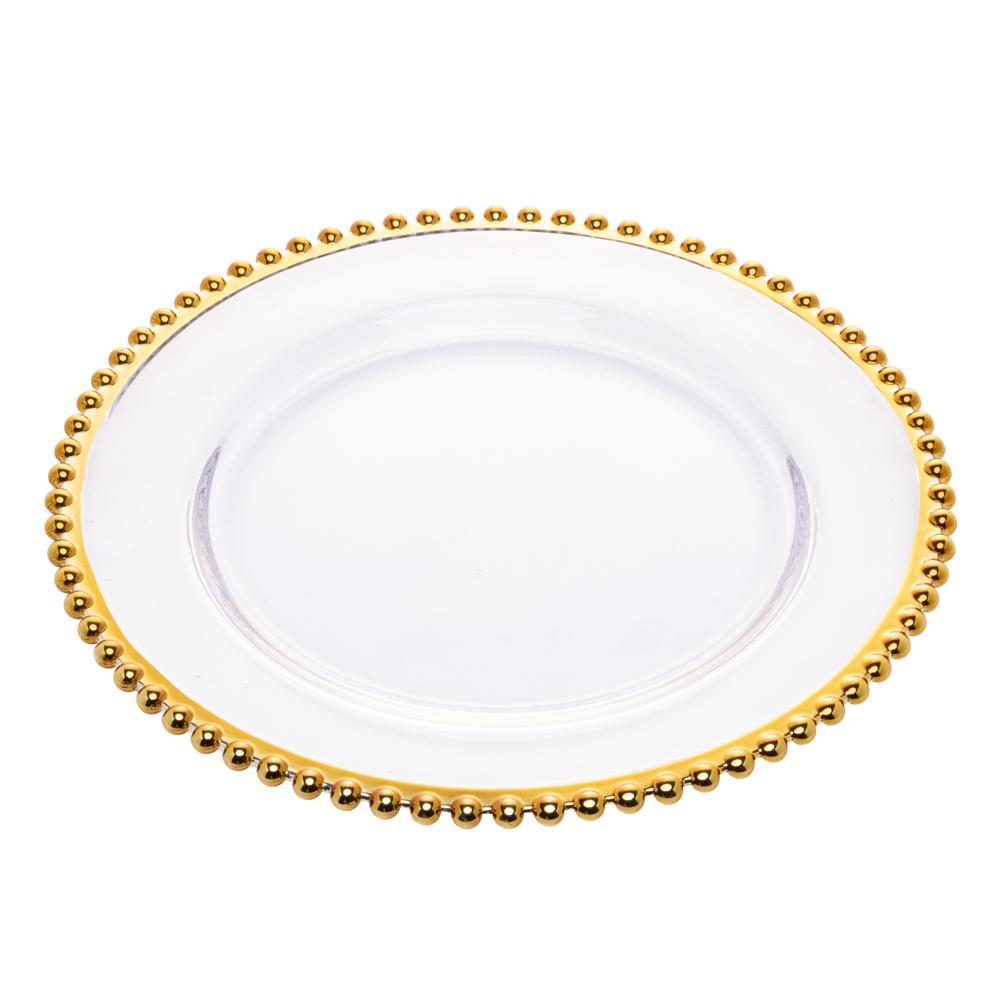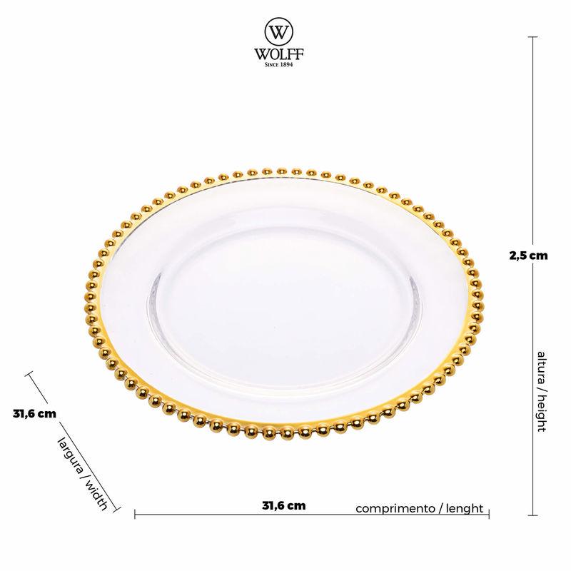 Símbolo de luxo e elegância, a Wolff foi fundada em 1894 na Alemanha. O portfólio divide-se em itens de porcelana e cristal importados com exclusividade e em itens de prata e inox produzidos na fábrica nacional, com mão de obra altamente treinada e especializada..Sousplat Wolff Pearl de Cristal 32cm.O sousplats de cristal transparente com borda dourada PEARL WOLFF possui lapidação em bolinhas na borda, inspirada na beleza e no brilho único das pérolas. É ideal para proporcionar um ambiente com mais glamour e sofisticação a mesa, além de oferecer proteção contra resíduos de alimentos que possam cair no colo durante as refeições. WOLFF, há mais de um século servindo bem..Material: CRISTAL.Cor : DOURADO.Medidas: Largura: 31,6cm x Altura: 2,5cm x Comprimento: 31,6cm.Peso do Produto (kg): 1.58.Garantia: 90 dias