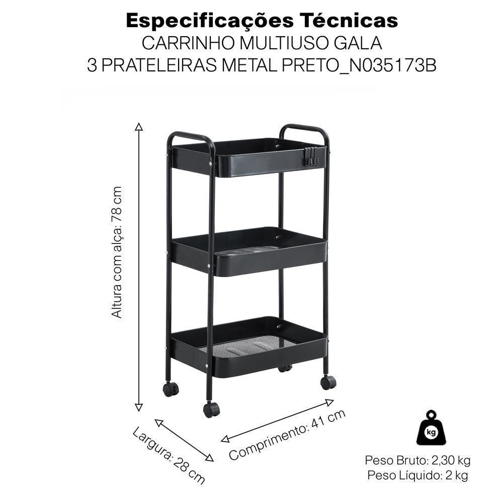 Carrinho Multiuso Gala 3 Prateleiras Metal Preto