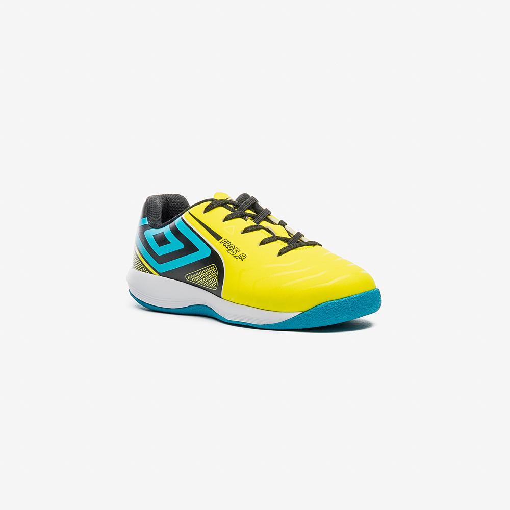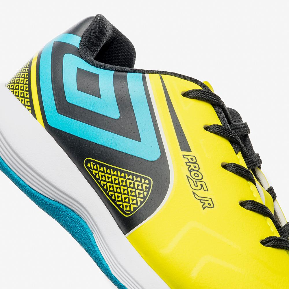 Seja o astro infantil das quadras com a Chuteira Futsal Umbro Pro 5 Jr. Ela é perfeita para as crianças e adolescentes que procuram conforto e qualidade para melhorar seu jogo. O cabedal (parte superior do calçado) é construído em material laminado emborrachado com grafismo personalizado, sistema de lingueta convencional e o autêntico Diamante Umbro aplicado em serigrafia na lateral. O solado de futsal possui entressola super macia em EVA de ponta a ponta com soleta em borracha, que proporciona maior durabilidade e aderência ao solo.