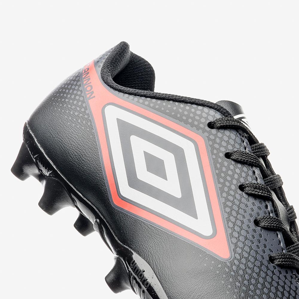 Indicada para os jogadores mirins iniciantes, a Chuteira Campo Umbro Cannon Jr segue o mesmo design autêntico e ousado do modelo adulto, produzida em material de fácil limpeza e manutenção. O modelo exibe artes gráficas personalizadas em cores vibrantes que adicionam o melhor do estilo Umbro aos seus treinos e partidas.Seu cabedal é construído em material sintético laminado com aplicação de grafismo reticulado e forro em tecido de poliéster. Possui Diamante Umbro na lateral estilizado com a assinatura do modelo, atacador convencional e palmilha interna em EVA forrado. O solado de campo FG de 14 travas é construído em PVC.