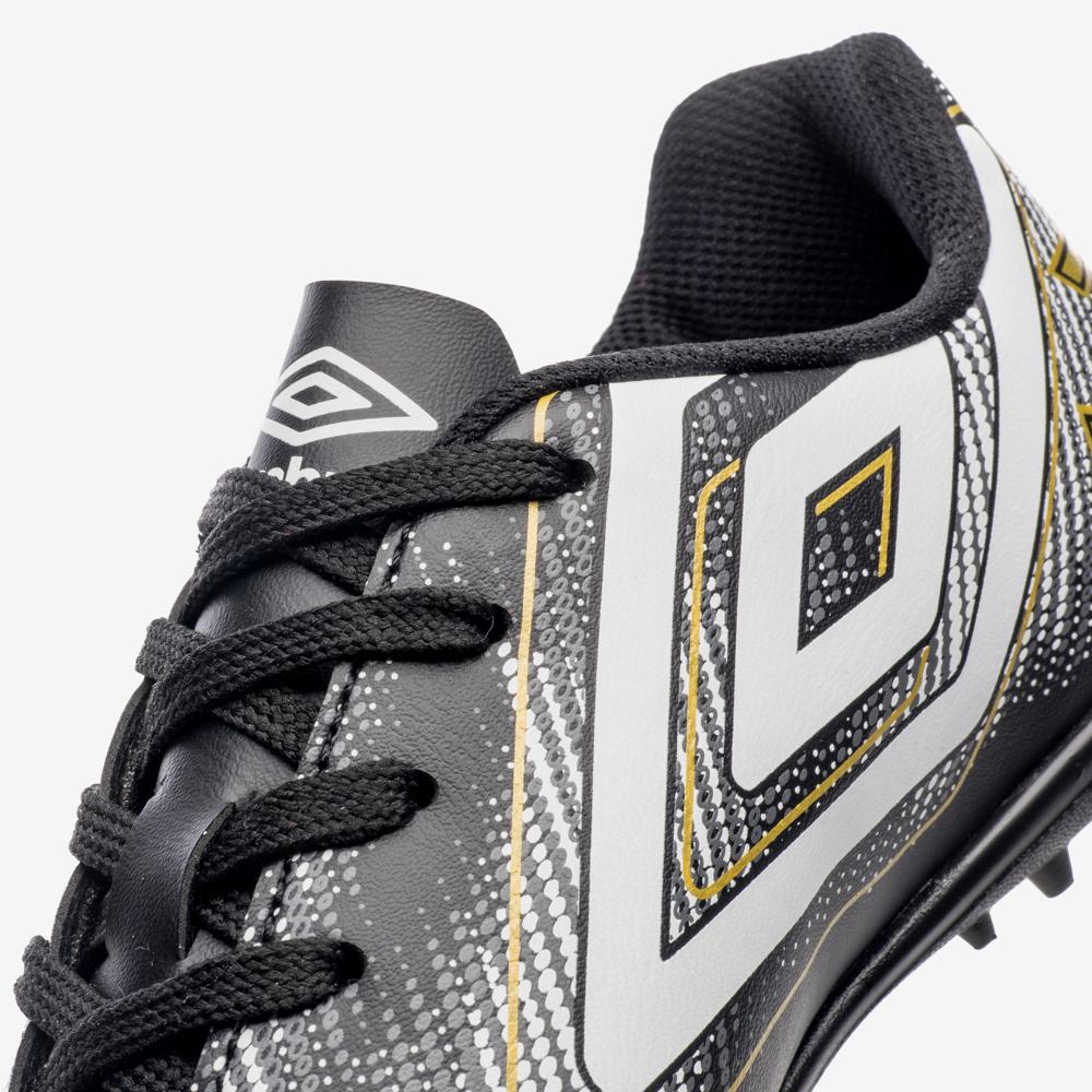 Chuteira Society Umbro Heatmap Jr: A Escolha Ideal para Jovens JogadoresSe você está em busca de uma chuteira que combine estilo, conforto e desempenho, a Chuteira Society Umbro Heatmap Jr é a escolha perfeita para jovens atletas. Com um design moderno e inovador, este modelo é ideal para jogadores iniciantes que desejam se destacar em campo.Design Moderno e AtraenteO visual da Chuteira Umbro Heatmap Jr é um dos seus grandes diferenciais. Com um grafismo que simula um mapa de calor, esta chuteira não só oferece uma aparência contemporânea como também reflete a energia e a paixão do futebol. O Diamante Umbro centralizado e as letras HM em destaque na parte traseira garantem um toque de autenticidade e estilo.Conforto InigualávelO conforto é essencial para um bom desempenho em campo. A palmilha interna da Chuteira Heatmap Jr é feita em EVA forrado em tecido, proporcionando uma maciez que permite longas horas de jogo sem desconforto. Assim, os jovens jogadores podem se concentrar em suas habilidades e no jogo, sem se preocupar com o calçado.Atributos do Produto Marca: Umbro Modelo: U07FB00336 Cor: Preto, Branco, DouradoDesempenho Superior em CampoO solado da Chuteira Society Umbro Heatmap Jr é projetado para oferecer o máximo de tração e estabilidade. Fabricado em material PVC, ele conta com um sistema de travas em barra e chevron, que proporciona uma aderência eficaz em superfícies de futebol society. Isso garante que os jovens jogadores possam se movimentar com agilidade e confiança durante os jogos.ConclusãoA Chuteira Society Umbro Heatmap Jr é a combinação perfeita de estilo, conforto e desempenho, ideal para jovens jogadores que estão começando sua jornada no futebol. Com um design inovador e recursos que promovem o bem-estar e a performance, essa chuteira é uma escolha inteligente para quem deseja se destacar em campo.Não perca a oportunidade de elevar o seu jogo! Adquira agora a sua Chuteira Society Umbro Heatmap Jr e experimente a diferença que um bom calçado pode fazer!