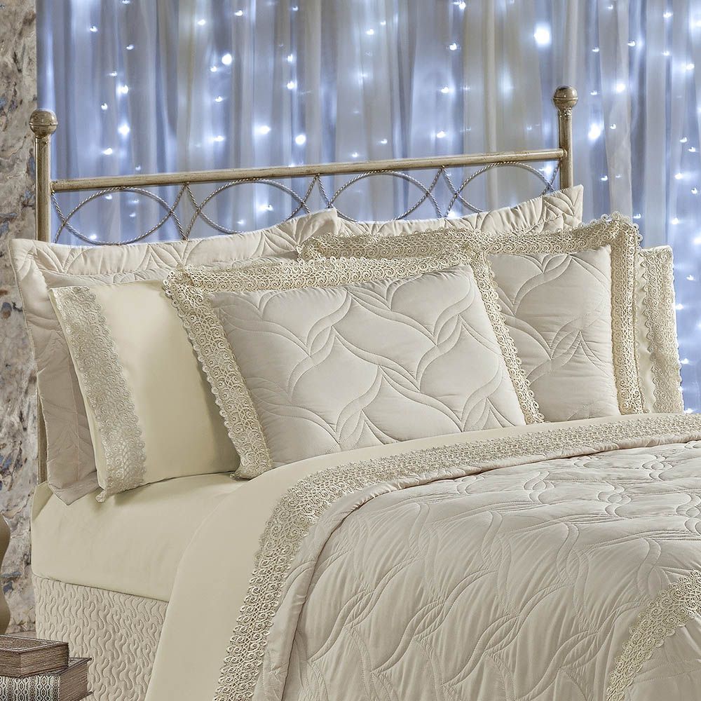 Kit Royalle confeccionado em Microfibra Peletizada, tecido que não faz bolinhas, lindo matelado, acompanha quatro porta travesseiros (dois decorados com guipir e dois matelados), peças que ornamentam e fazem toda diferença em uma decoração glamourosa de alto padrão. Contêm na Embalagem: 01 Cobre Leito 2,70m comprimento x 2,60m largura 02 Porta travesseiros (matelados) 80cm x 60cm 02 Porta Travesseiros (c/ guipir) 75cm x 55cm 02 Refis Travesseiros (enchimento) 65cm x 45cm * o jogo de lençol NÃO acompanha o produto. Composição: Tecido Superior: 100% Poliéster Tecido Inferior: 100% Poliéster Enchimento: Manta 100% Poliester