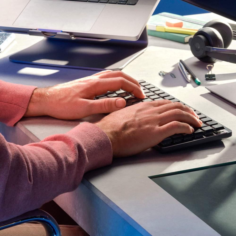 Apresentando o MX Mechanical Mini - um teclado minimalista com toque, precisão e desempenho extraordinários. A digitação mecânica de baixo perfil oferece feedback satisfatório na sua escolha de teclas; Silencioso tátil, clicável ou linear. MX Mechanical Mini foi criado para oferecer conforto ergonômico, com iluminação inteligente e Easy-Switch; permitindo que você conecte até 3 dispositivos e permaneça no fluxo por horas.