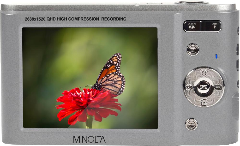 Monitor LCD de 2,9 polegadasMonitor LCD de 2,9 polegadas para visualização nítida e fácil navegação, 44,0 megapixelsCaptura fotos estáticas de até 44,0 megapixels que você pode cortar ou ampliar sem perder qualidade de imagem, zoom digital de 16xLente de ângulo perfeito integrada com zoom digital de 16x para aproximar você da ação quando necessário, vídeo Quad HD de 2,7KGrava vídeo 2,7K QHD 30FPS com detalhes ricos e cores vibrantes, anti-vibraçãoA estabilização de imagem digital anti-vibração ajuda você a compor sua melhor foto. Modos de fotografia especiaisOs modos de disparo inteligentes incluem 9 modos de cena, sequência de fotos, detecção de rosto e captura de sorriso, iluminação assistidaLuz LED branca para ajudar a aumentar a clareza em ambientes mais escuros. Design compactoSuperfino e fácil de transportar - leve seu Minolta aonde quer que você vá, 32 GB de memória incluídaInclui um cartão de memória SD de 32 GB para que você possa usar a câmera assim que a tirar da caixa