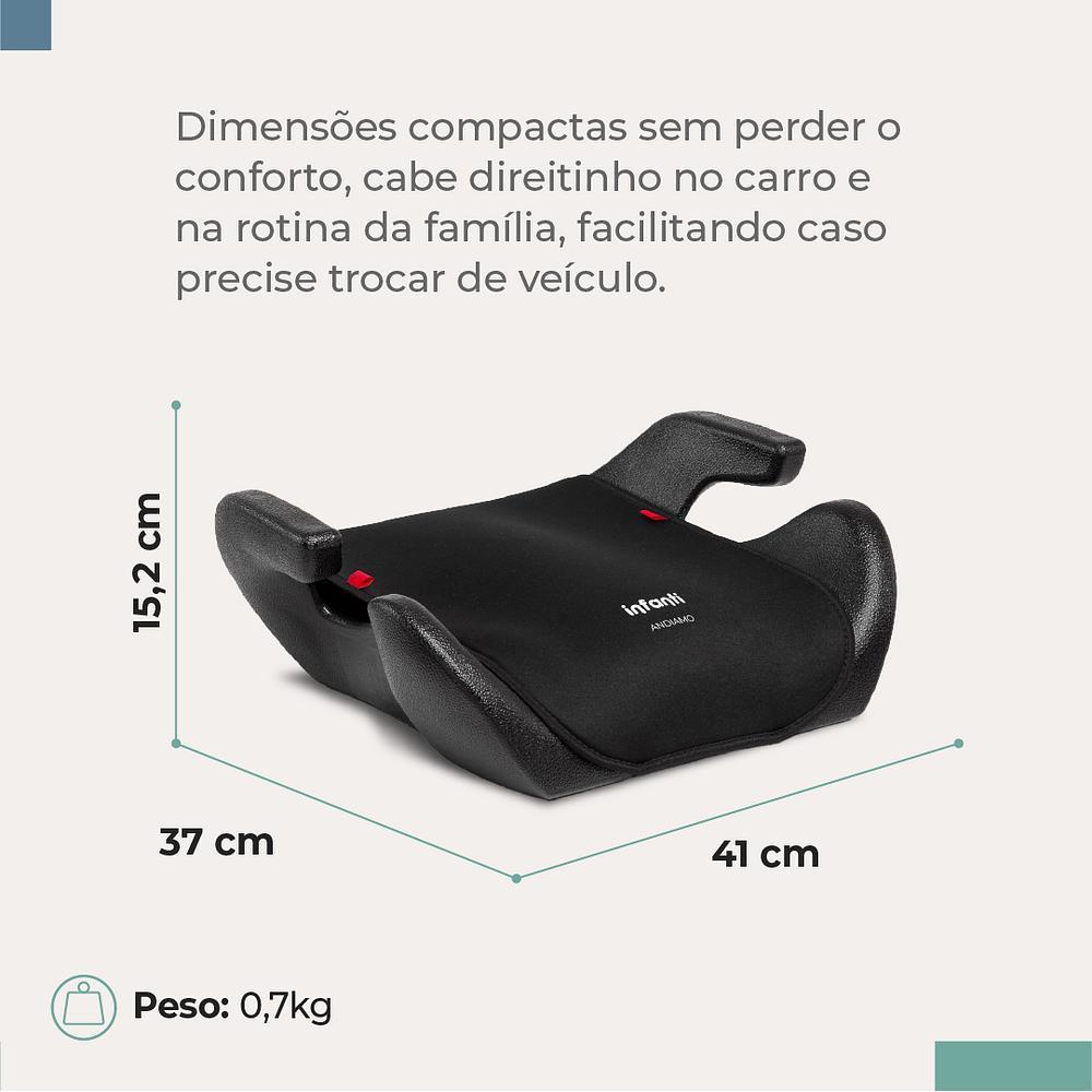 Assento de Elevação Booster Andiamo - InfantiO Assento de Elevação Booster Andiamo da Infanti é a escolha perfeita para crianças que estão crescidas, mas ainda precisam de segurança e conforto em todas as viagens. Características: • Indicado para crianças maiores: Proporciona a elevação correta para segurança com o cinto de segurança veicular. • Leve e Prático: Pesa menos de 1kg, facilitando o transporte e instalação. • Fácil Instalação: Conta com sinalização para uso correto do cinto, garantindo segurança ideal. • Apoio de Braços: Proporciona mais ergonomia e melhor posicionamento das pernas. • Capa Removível e Lavável: Mantém o assento sempre limpo e higienizado. • Design Compacto: Ideal para a rotina agitada das famílias modernas.Especificações Técnicas: • Tipo: Booster de elevação • Peso: Menos de 1kg • Material: Estrutura resistente e capa de tecido lavável • Idade Recomendada: Crianças maiores, conforme manual do produto • Dimensões: Verificar manual • Compatibilidade: Uso com cinto de segurança do veículo • Garantia do fornecedor: 12 mesesDê ao seu filho a segurança e o conforto que ele merece com o Booster Andiamo da Infanti. Adquira agora e torne suas viagens mais tranquilas e seguras.