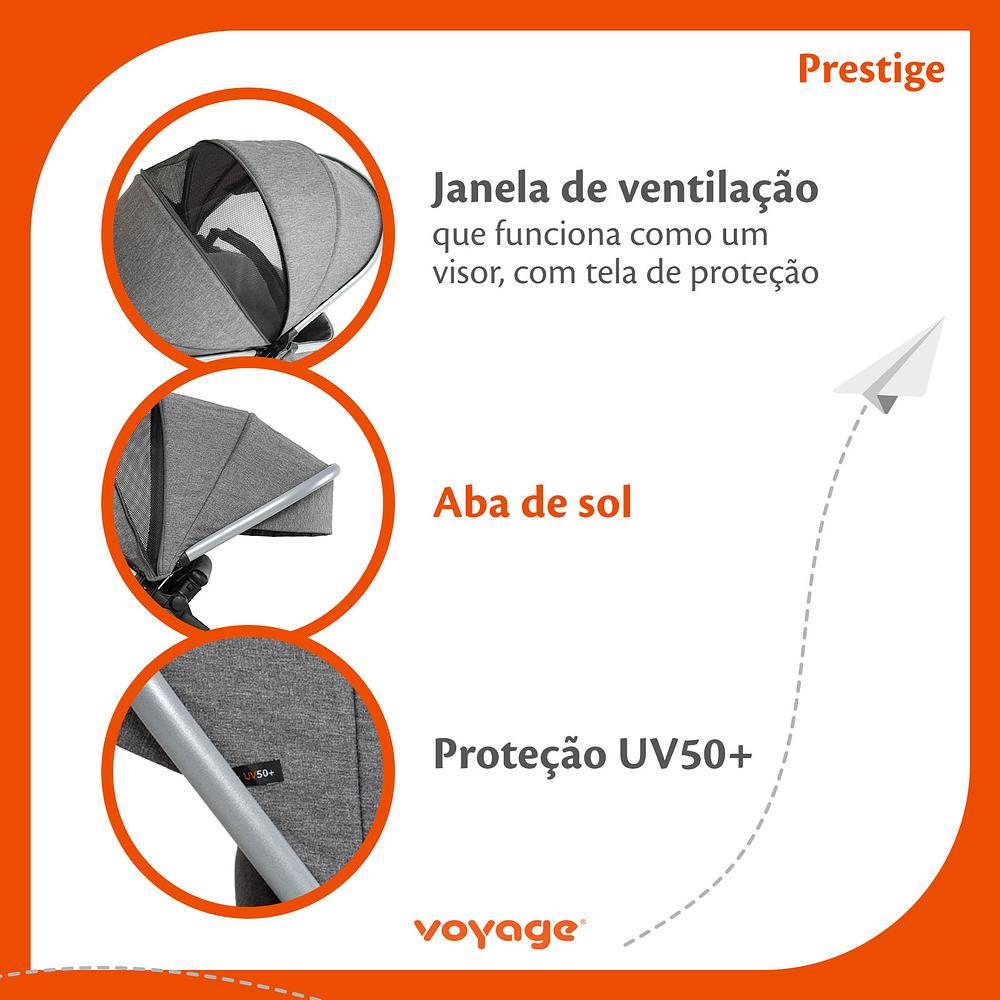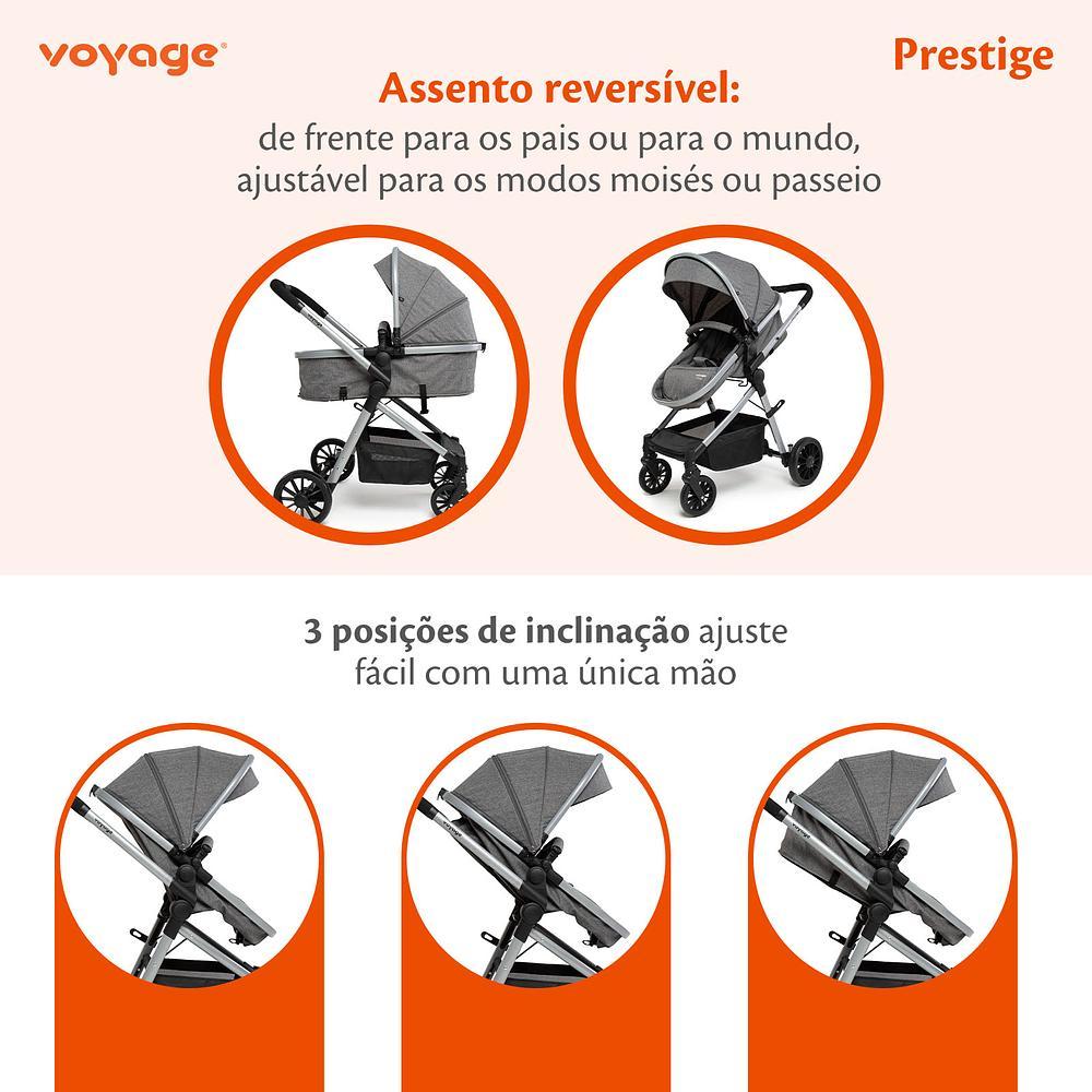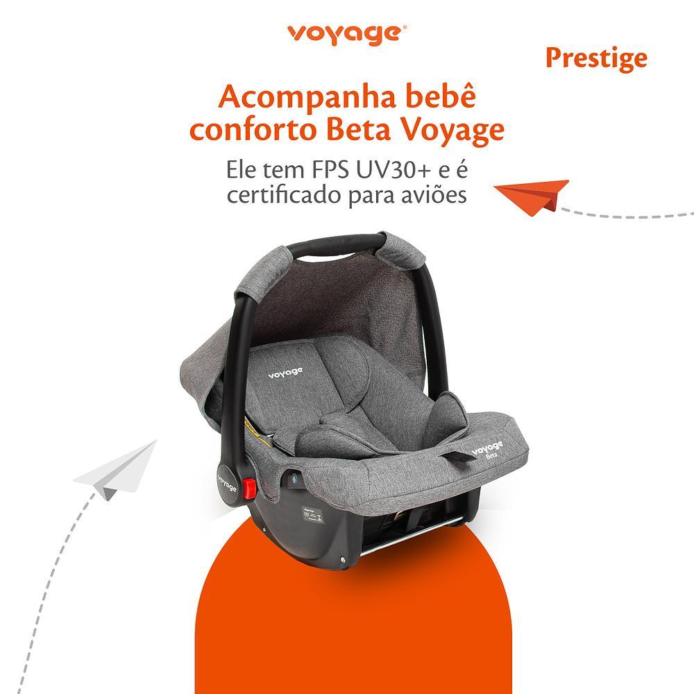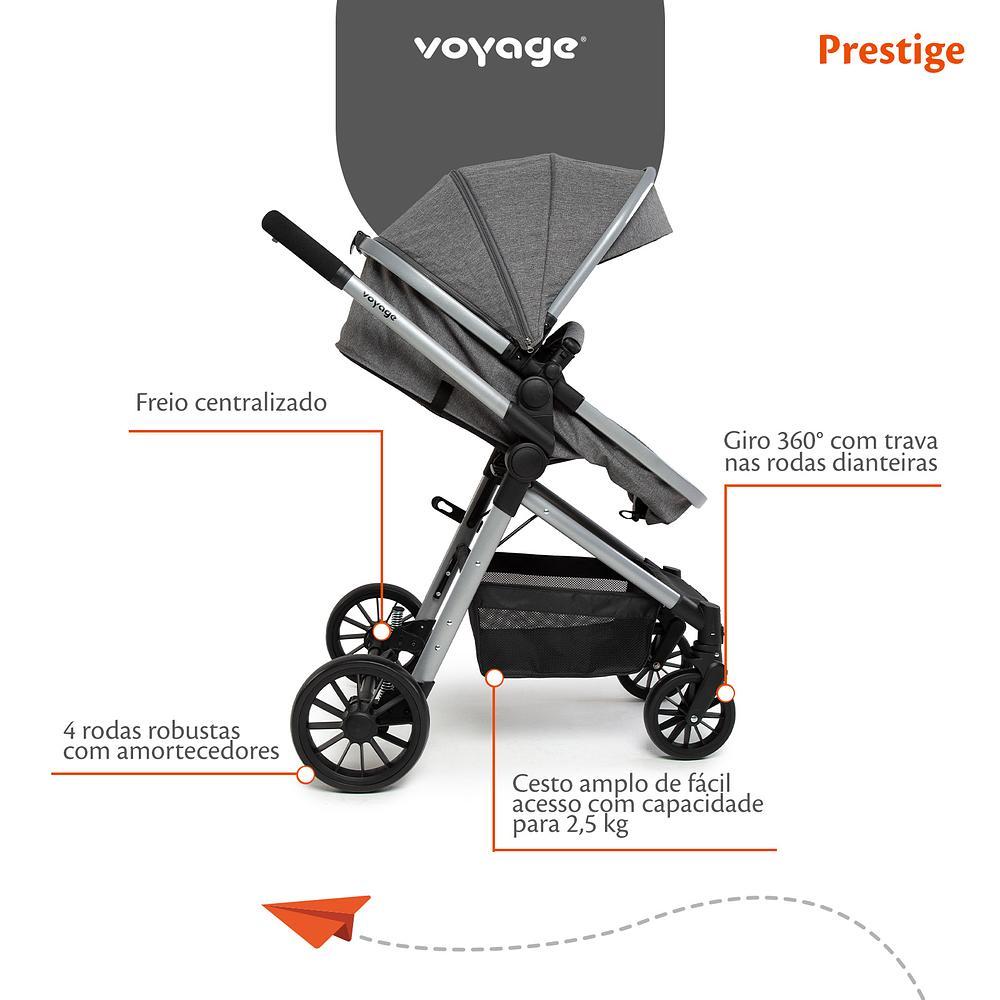 Carrinho com Bebê Conforto Travel System Prestige Duo - Voyage O Travel System Prestige Duo da Voyage, uma solução completa para pais que buscam praticidade, segurança e conforto para seus filhos. Este conjunto, composto por um carrinho versátil e um bebê conforto, é projetado para se adaptar às diversas fases de crescimento da criança, garantindo passeios agradáveis e tranquilos para toda a família.Características:•Assento Reversível: O design permite que o assento seja posicionado de frente para os pais nos primeiros meses de vida do bebê, e depois virado para frente, permitindo que a criança explore o mundo ao seu redor.•Amortecedores nas 4 Rodas: Equipado com robustas rodas amortecedoras, o Prestige oferece um passeio suave e confortável em diversos tipos de terreno.•Freio Centralizado e Rodas com Giro 360°: Sistema de freio eficiente e rodas dianteiras com giro 360° e trava, proporcionando segurança e flexibilidade nos movimentos durante o passeio.•Capota com Proteção UV50+: A capota do carrinho vem com proteção solar UV50+, aba de sol e janela de ventilação com tela, garantindo conforto e proteção contra os raios solares.•Cesto Amplo: Capacidade para até 2,5 kg, o cesto é de fácil acesso e permite transportar todos os itens para o cuidado do bebê.•Assento com Múltiplas Inclinações: Oferece 3 posições de inclinação, incluindo a posição antirrefluxo ideal para recém-nascidos, ajustável com apenas uma das mãos.•Barra Frontal com Abertura: Facilita a colocação e a retirada da criança do carrinho, além de contar com cinto de segurança de 5 pontos ajustável.•Compatibilidade: Inclui o BBC Beta da Voyage, adaptadores, almofada acolchoada, capota removível e capa lavável na máquina.O Travel System Prestige Duo da Voyage é a escolha perfeita para pais que não abrem mão da segurança, do conforto e da versatilidade. Esse conjunto promete ser o companheiro ideal em cada fase do crescimento do seu filho, tornando cada passeio uma experiência única e especial.