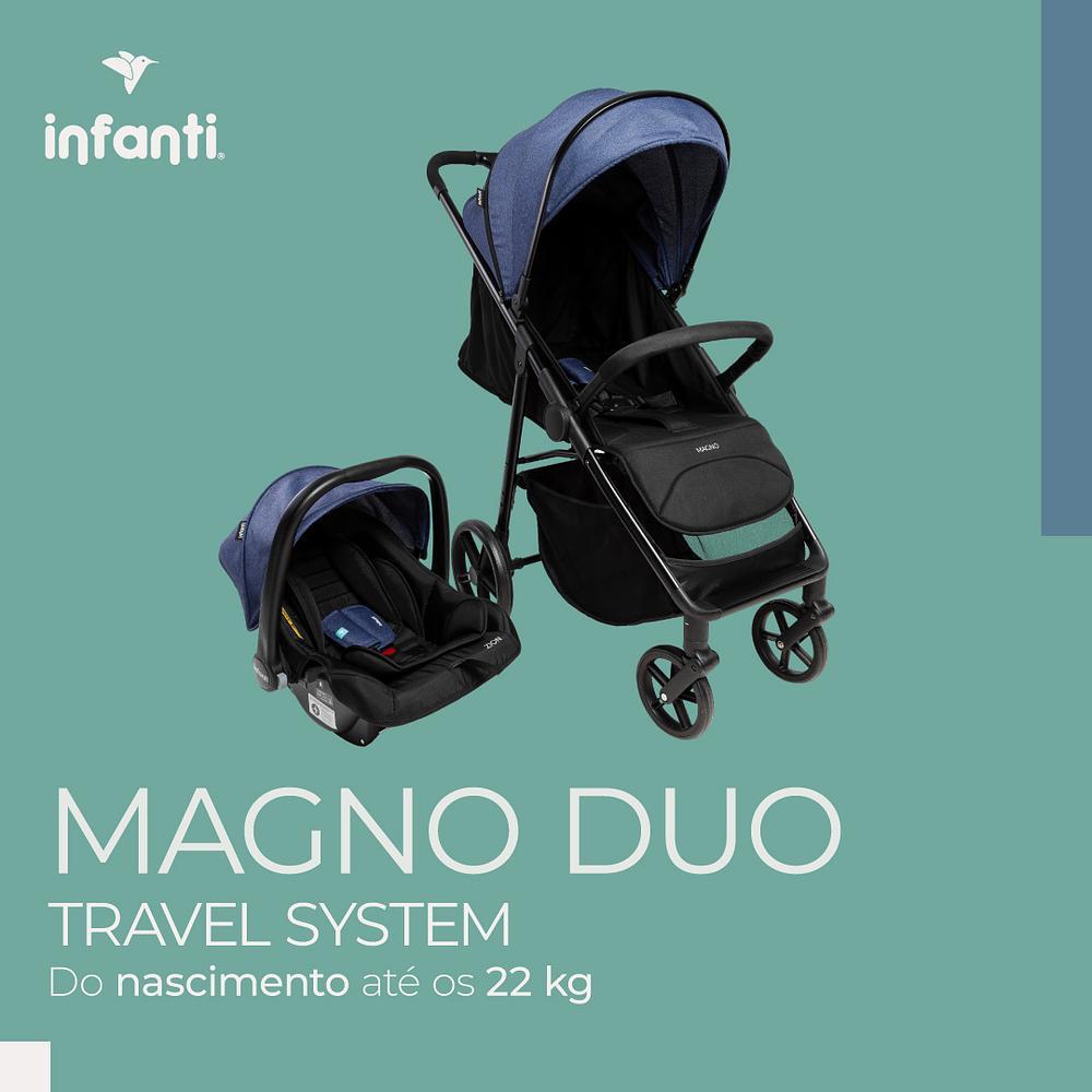 Carrinho com Bebê Conforto Travel System Magno Duo - InfantiO Travel System Magno Duo da Infanti combina elegância, segurança e praticidade, simplificando cada saída de casa com o seu bebê. Com o carrinho Magno e o bebê conforto Zion, você garante uma experiência contínua e confortável desde os primeiros dias.Características: • Indicação: Desde o nascimento até 22 kg. • Conjunto Completo: Inclui carrinho e bebê conforto, para uso no carro e em passeios. • Encaixe Simples: Mudança fácil entre carrinho e bebê conforto. • Rodas Grandes: Amortecedores nas quatro rodas garantem passeios suaves em quaisquer terrenos. • Assento Elevado: Aproxima o bebê de quem cuida, proporcionando mais interatividade. • Manopla Alta: Ergonomia para empurrar com conforto. • Encosto Reclinável: Várias posições ajustáveis para máximo conforto. • Apoio de Pés: Ajustável com inclinação para cima. • Capota Completa: Extensão com zíper, visor, aba de sol e proteção UV50+. • Cesto Família: Espaçoso (3 kg) com acesso pela parte de trás. • Fechamento Fácil: Pode ser feito com uma só mão.Características do Bebê Conforto Zion: • Alça com 4 Posições: Ajustável para máxima comodidade. • Capota Ajustável: Proteção UV50+, ideal para dias ensolarados. • Acolchoamento Macio: Acomoda recém-nascidos com total segurança e conforto.Especificações Técnicas • Tipo: Sistema Completo de Viagem (Travel System) • Fechamento: Com uma só mão • Rodas: 4 com amortecedores • Capota: Extensível com zíper e proteção UV50+ • Cinto de Segurança: 5 pontos com ajuste • Cesto de Armazenamento: Capacidade de 3 kg • Peso do Produto: Aproximadamente 10 kg • Dimensões do Carrinho: 103 x 60 x 72 cm • Dimensões do Bebê Conforto: 67 x 44 x 56 cm • Garantia do fornecedor: 12 meses.O Travel System Magno Duo da Infanti oferece uma solução completa e sofisticada para o bem-estar do seu bebê. Adquira já e transforme seus passeios em momentos de pura tranquilidade e segurança.