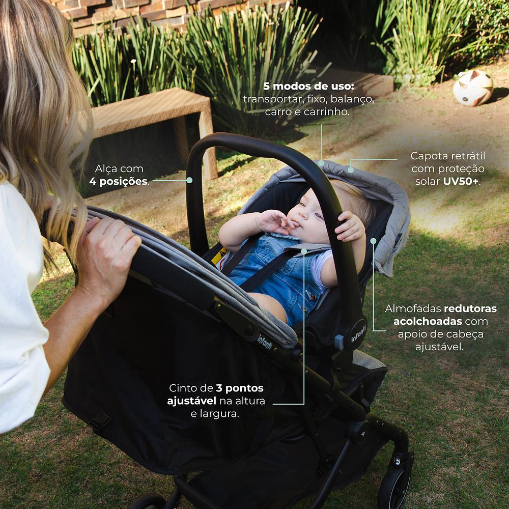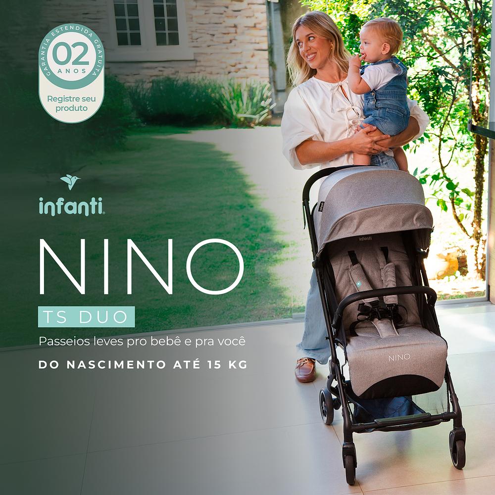 Carrinho com Bebê Conforto Travel System Nino Duo - InfantiO Travel System Nino Duo Infanti combina praticidade, segurança e conforto em um conjunto ideal para acompanhar o bebê desde o nascimento. Compacto, leve e com design inteligente, ele é perfeito para famílias que buscam mobilidade e cuidado em cada passeio, seja em casa, na cidade ou até nas viagens mais longas.Características do ProdutoCarrinho Nino:• Fechamento tipo pocket: ultracompacto e fácil de armazenar, ideal para espaços reduzidos e viagens, aprovado pela Associação Internacional de Transporte Aéreo (IATA) para levar como bagagem de mão.• Encosto reclinável em múltiplas posições: adapta-se ao momento do bebê, do soninho ao passeio.• Apoio para os pés ajustável em 7 posições: mais conforto conforme o crescimento.• Capota ampla com proteção UV50+: com visor e extensor para proteger do sol e do vento.• Cinto de 5 pontos: com protetores acolchoados e ajuste de altura e largura para máxima segurança.• Barra frontal removível: mais praticidade para colocar e retirar o bebê.• Rodas com amortecedores: garantem passeios suaves e seguros em diferentes terrenos.• Cesto de compras espaçoso: capacidade para até 5 kg, ideal para bolsas, brinquedos e mantinhas.• Estrutura leve e resistente: perfeita para o dia a dia e os deslocamentos da família.Bebê Conforto Zion:• Indicado desde o nascimento até 13 kg (Grupo 0+): acompanha o bebê com segurança e conforto.• Almofadas redutoras e apoio de cabeça reposicionável: acolhem e protegem os recém-nascidos.• Alça com 4 posições e 5 modos de uso: transportar, instalar no carro, fixar, balançar ou acoplar ao carrinho.• Capota retrátil com proteção UV50+: mantém o bebê protegido do sol e da luminosidade.• Cinto de 3 pontos ajustável: com regulagem de altura e largura para diferentes fases.• Compatibilidade perfeita: encaixa facilmente no carrinho através dos adaptadores inclusos.• Design ergonômico e estrutura leve: ideal para transportar com praticidade no dia a dia.Especificações TécnicasCarrinho Nino:• Tipo: berço e passeio• Idade/peso recomendado: 0 a 15 kg• Norma ABNT: NBR 14389-1:2022• Fechamento: tipo pocket, compacto e leve• Reclinável: múltiplas posições• Apoio para os pés: ajustável em 7 posições• Capota: com visor e proteção solar UV50+• Cinto de segurança: 5 pontos ajustável em altura e largura, com protetores acolchoados• Barra frontal: com abertura ou removível• Cesto: capacidade para 5 kg• Rodas: 4 rodas com amortecedores• Freios: centralizado• Material/Composição: aço, polipropileno (PP) e poliéster• Dimensões (A x L x P): 106,7 x 43,3 x 75,3 cm• Peso: 7,45 kgBebê Conforto Zion:• Norma ABNT: NBR 14400:2020• Grupo: 0+ (0 a 13 kg)• Instalação: de costas ao movimento, com cinto de 3 pontos do veículo• Redutor e apoio de cabeça: almofadas acolchoadas reposicionáveis• Cinto de segurança: 3 pontos com ajuste de altura e largura• Capota: retrátil com proteção solar UV50+• Material/Composição: HDPE e poliéster• Dimensões (A x L x P): 62 x 43 x 53 cm• Peso: 2,5 kgInformações Gerais:• Conteúdo da embalagem: 1 carrinho Nino, 1 bebê conforto Zion, 1 par de adaptadores e 2 manuais• Garantia do fornecedor: 12 meses• Imagens meramente ilustrativas.Com o Travel System Nino Duo Infanti, cada passeio é uma experiência de conforto, leveza e segurança. Compacto, versátil e repleto de detalhes pensados para o dia a dia, ele é o parceiro ideal para acompanhar o bebê desde os primeiros dias, com todo o cuidado e a praticidade que as famílias modernas precisam.