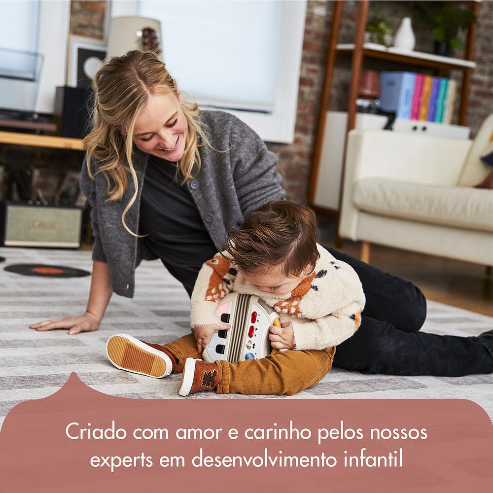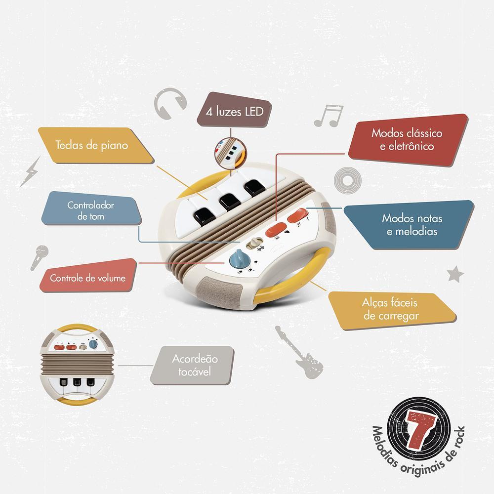 Acordeão Eletrônico Tiny Rockers - Tiny LoveO Acordeão Eletrônico Tiny Rockers da Tiny Love é o brinquedo perfeito para estimular a criatividade e o desenvolvimento sensorial dos pequenos, proporcionando a experiência real de tocar um acordeão! Ideal para crianças a partir de 1 ano, este acordeão combina música, diversão e aprendizado, auxiliando no desenvolvimento das habilidades motoras, cognitivas e sensoriais.Principais Características:•Experiência Sensorial Completa : O acordeão pode ser apertado e esticado como um instrumento real, promovendo estímulos sensoriais.•Teclas com Luzes e Sons : As teclas funcionam como um piano, com luzes que divertem o bebê e incentivam a coordenação motora e cognitiva.•Modos de Exploração Musical : Permite tocar notas como na escala musical ou reproduzir uma das sete melodias de rock, incentivando a criatividade.•Botões de Controle de Tom : O controle de efeitos sonoros torna a experiência musical mais rica e estimula o desenvolvimento cognitivo.•Portátil e Prático : Com alças e alto-falantes de qualidade, o acordeão pode ser levado para qualquer lugar, proporcionando uma experiência completa de música e diversão.Especificações Técnicas:•Idade Recomendada : A partir de 1 ano•Dimensões : 18 x 18 x 5 cm (A x C x P)•Peso do Produto : 385 g•Material : ABS, PP, EVA, componentes eletrônicos•Certificação de Segurança : CE-BRI/IQB 006367 56059/24-002•Alimentação : 2 pilhas AAA (1,5 V) (não inclusas)•Controle de Volume : Possui 3 níveis de volume exclusivosO Acordeão Tiny Rockers da Tiny Love é mais que um brinquedo; é uma ferramenta para descobrir o mundo da música e da criatividade. As luzes, as músicas de rock e o design portátil transformam cada momento em uma verdadeira experiência musical!