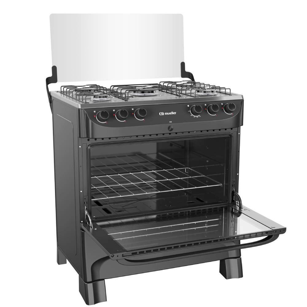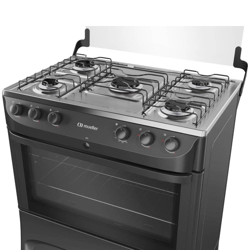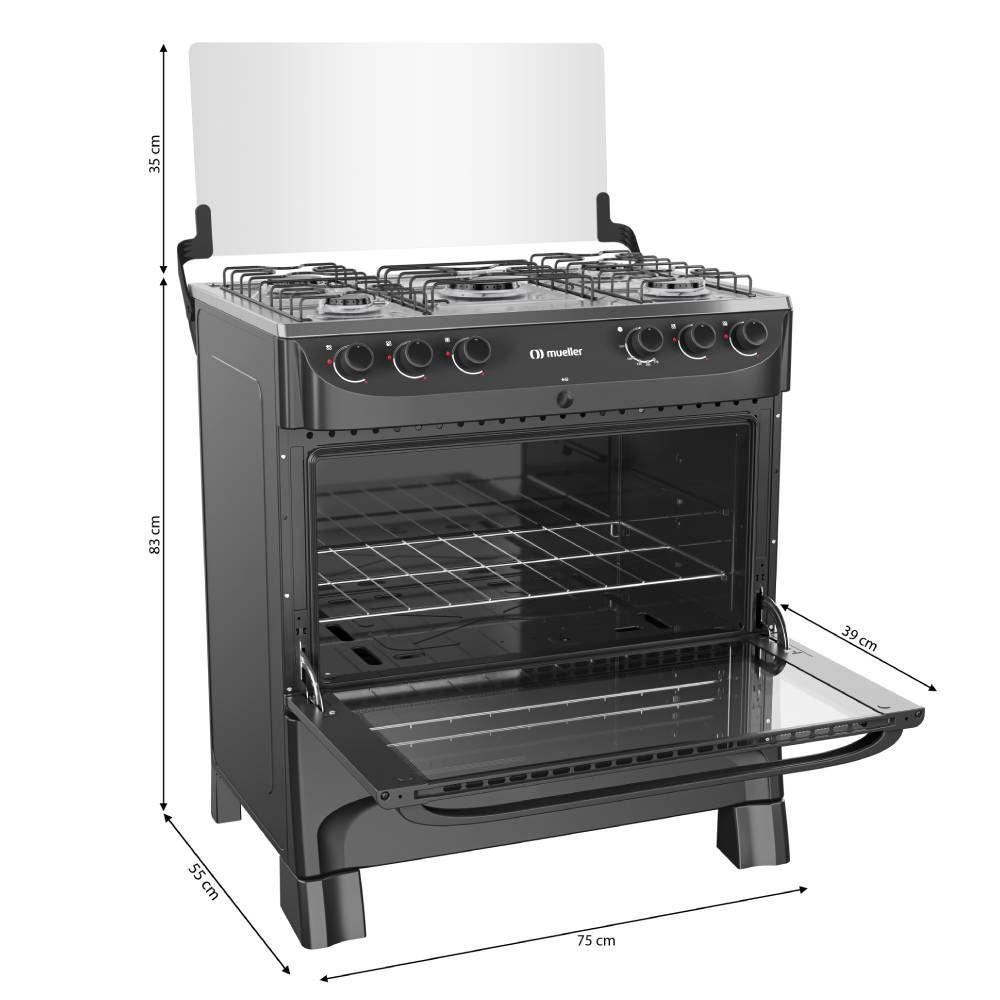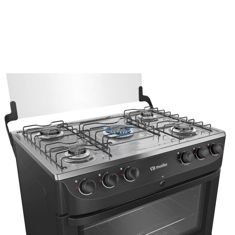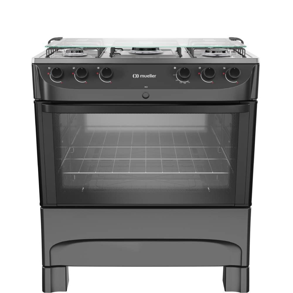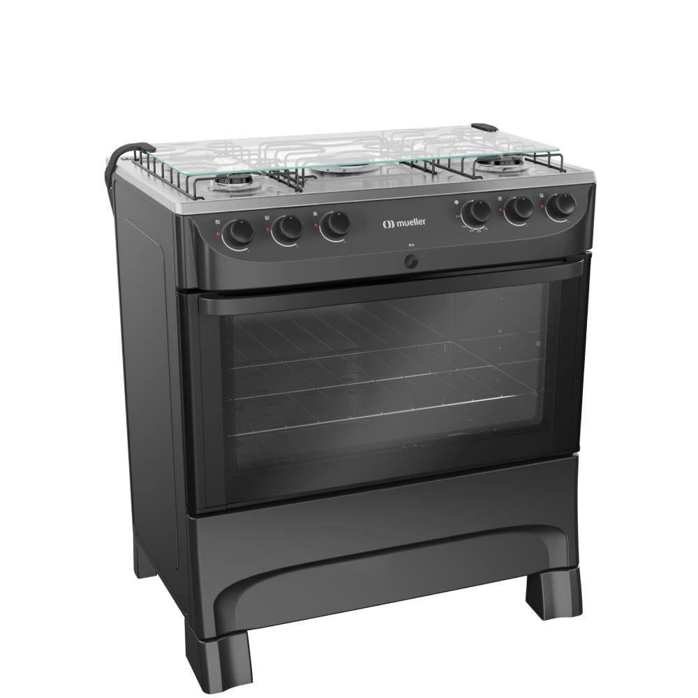 Fogao Mueller 5 Bocas Preto Mesa de Inox — Mais espaço e potência para suas grandes receitasO Fogão Mueller 5 bocas é a escolha ideal para quem precisa de mais espaço e performance na cozinha. Projetado para quem ama cozinhar, ele oferece a capacidade e a potência necessárias para preparar múltiplas receitas ao mesmo tempo com total eficiência.O forno de grande capacidade, com 81,6 litros, permite assar peças inteiras e pratos maiores sem dificuldade. A limpeza também é descomplicada, com acabamento interno Total Clean e aos botões removíveis. É um fogão de construção robusta, pensado para oferecer a confiança e a durabilidade que um dia a dia agitado na cozinha demanda.Informações Gerais:Marca: MuellerModelo: MFI5BBCor: PretoTipo: PisoQuantidade de queimadores: 5Tipo de gás: GLP (Conversível para GN)Voltagem: BivoltAcendimento: Automático totalClassificação energética: A Potência dos queimadores: Queimador ultra chama 3700w / Queimador família 2000w / Queimador médio1700 w / Potência do queimador do forno 2600wPossui Tampa (tampo sobre a mesa): SimLuz no forno: NãoTemperatura do forno: 170-290 (grau célsius)Capacidade do Forno: 81,6 L Puxador do forno: Metal com abertura ergonômica Grades deslizantes no forno: Não (uma grade ajustável em dois níveis de altura)Duplo vidro na porta do forno: Não (vidro interno da porta não é removível)Botões removíveis para limpeza: SimTrava de segurança: Sim (válvula de segurança)Material da mesa: InoxAcabamento Interno do Forno: Total CleanPés niveladores: NãoTipo de grades: 3 grades de mesaPorta do forno com visor panorâmico: Porta de vidroDimensões internas do forno A 30,5 x L 64 x P 41cm Dimensões do Produto Embalado: L 76 x A 88,5 x P 56 cmPeso Bruto: 25,1 kgDimensões: L 75 x A 87 x P 55 cmPeso: 23,1 kgGarantia: 12 mesesImportante: As imagens podem sofrer variações de acordo com a resolução de seu monitor, iluminação ou ainda, percepção visual.
