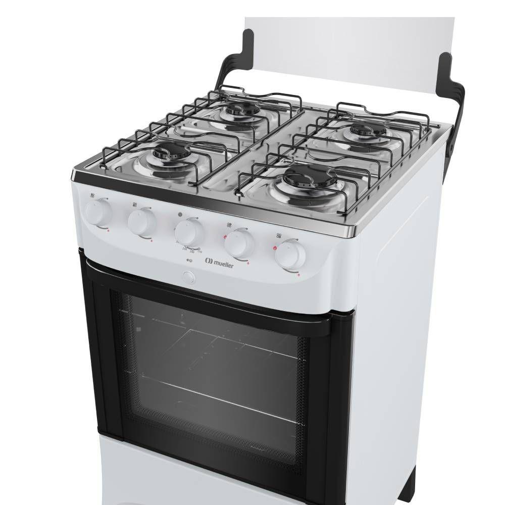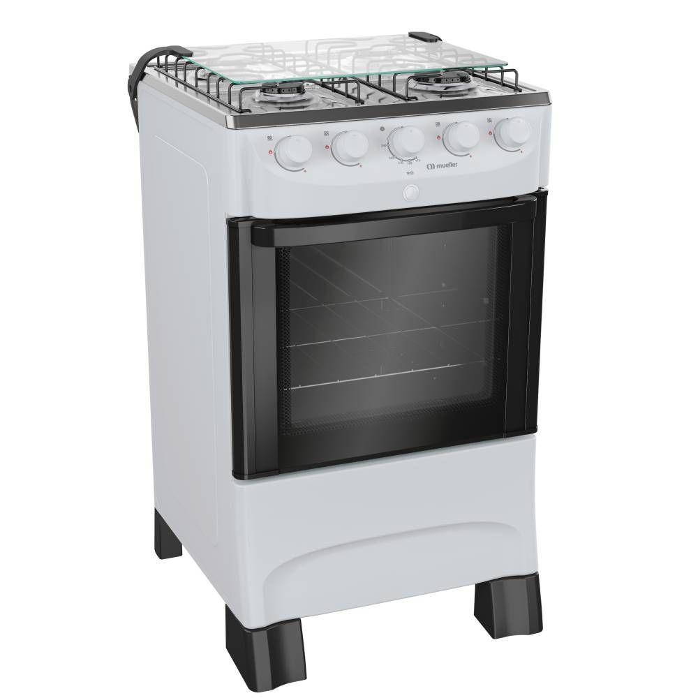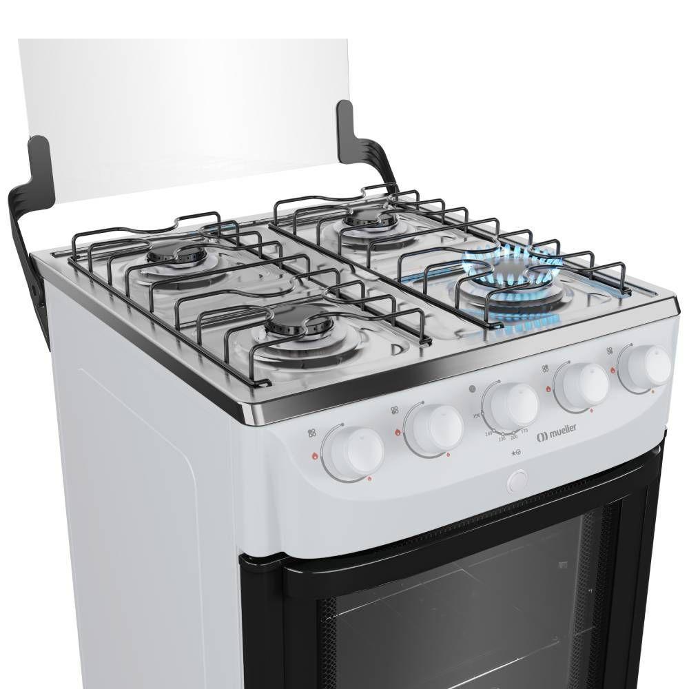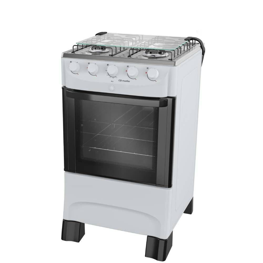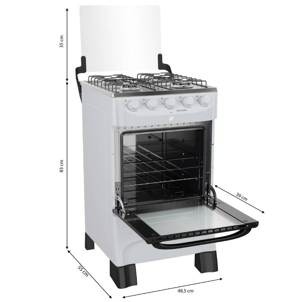 Fogao Mueller 4 Bocas Branco Mesa de Inox com Acendimento Automatico — Cozinhe com mais tranquilidade todos os diasO Fogão Mueller 4 bocas é o parceiro ideal para a sua cozinha, combinando a praticidade que a rotina pede com a segurança e a economia que sua família merece. Seu design clean na cor branca se adapta facilmente a qualquer ambiente.A praticidade começa no primeiro giro: com o acendimento automático total, você acende tanto os queimadores da mesa quanto o forno com um simples toque. A mesa em inox conta com um queimador Família de alta potência, ideal para panelas maiores e para acelerar o preparo das suas receitas. A limpeza após o uso também é mais simples, graças aos botões removíveis que facilitam o acesso e a remoção da sujeira. O forno de 48,1 litros possui visor panorâmico e uma grade com dois níveis de altura, oferecendo versatilidade para seus assados.Informações Gerais:Marca: MuellerModelo:MFI4BBCor: BrancoTipo: PisoQuantidade de queimadores: 4Tipo de gás: GLP (Conversível para GN)Voltagem: BivoltAcendimento: Acendimento automático total, na mesa e no fornoVolume do forno: 48,1 LClassificação energética: A Potência dos queimadores: Queimador família: 2000w / Queimador médio:1700w / Potência do queimador do forno:1900wLuz no forno: NãoGrades deslizantes no forno: Não (possui uma grade ajustável em dois níveis de altura)Duplo vidro na porta do forno: NãoBotões removíveis para limpeza: SimTrava de segurança: Válvula de segurança: SimMaterial da mesa: InoxPés niveladores: NãoTipo de grades: 2 grades de mesaPorta do forno com visor panorâmico: De vidroDimensões do Produto Embalado: 50 L x 88,5 A x 56 P cmPeso Bruto: 17,7 kgDimensões: 48,5 L x 87 A x 55 P cmPeso: 16,4 kgGarantia: 12 mesesImportante: As imagens podem sofrer variações de acordo com a resolução de seu monitor, iluminação ou ainda, percepção visual.
