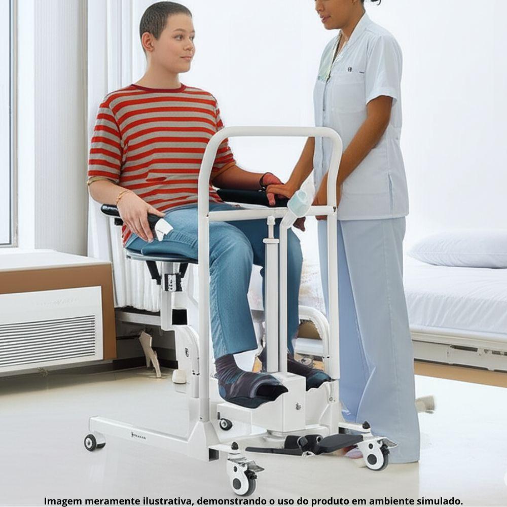 Cadeira De Transferência Higiênica Elétrica Até 135KG D80 Dellamed 6956A Cadeira de Transferência Higiênica Elétrica Dellamed D80, ideal para pessoas com mobilidade reduzida. Com assento de 48,5 cm e capacidade para até 135 kg, essa cadeira oferece sistema de elevação eletrônico, facilitando a transferência entre ambientes. Versátil, funciona como cadeira de transferência, cadeira de transporte interno e cadeira sobre vaso, proporcionando conforto e praticidade. Fabricada com estrutura de aço carbono e espuma rígida de poliuretano, possui rodas com trava, garantindo segurança e estabilidade. A classificação IP44 oferece proteção contra respingos de água, sendo ideal para banheiros. A cadeira vem com bateria de lítio com até 180 ciclos de autonomia e montagem simples com apenas 12 peças.Importante: A Cadeira Dellamed D80 é limitada a uso residencial e não é indicada para necessidades assistenciais intensas.Especificações Técnicas:Marca: DellamedModelo: D80Capacidade: Suporta até 135 kgComposição: Aço carbono, pintura epóxi, espuma rígida de poliuretanoCor: Estrutura branca, assento e encosto em pretoClassificação 4x1: Transferencia, transporte interno, higienica e sobrevasoRodas: 4 rodas com travas nas traseirasTipo: Cadeira elétrica com sistema de elevaçãoConteúdo da Embalagem: Cadeira de transferência D80 Dellamed e manualCertificação Anvisa: 80795950038Bateria: Bateria de lítio recarregável, bateria interna de 22.2V max 24V 4000 mAh Aproximadamente 180Variação de Altura do Assento: Mínimo 40 cm e máximo 73 cmMedidas Embalado: 58 L x 90 A x 34 P cmDimensões do Assento: 48,5 L cm x 51 P cmDimensões do produto: 54,5 L x 98 A x 54,5 P cmDimensões da embalagem: 58 L x 90 A x 34 P cmPeso Liquido: 27,8 kgPeso Bruto: 31,4 kgGarantia: 9 meses estrutura e 03 meses demais componentesObservação: A Cadeira de Transferência Dellamed não permite o uso em posição totalmente deitada. O equipamento foi desenvolvido para auxiliar em transferências na posição sentada e não substitui macas ou camas hospitalares. Seu uso deve respeitar os limites de elevação e inclinação indicados pelo fabricante.