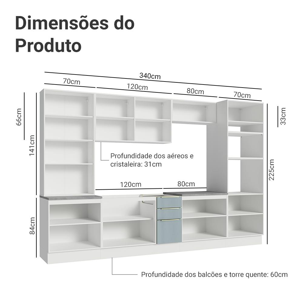 O Armário de Cozinha Completa Lux da Madesa combina um visual sofisticado e contemporâneo com alta funcionalidade.Fabricada com padrão de qualidade superior, a cozinha conta com vidro incolor sobreposto nas frentes e portas. Além disso, os puxadores são em alumínio, as gavetas abrem totalmente e as portas possuem amortecimento para fechamento suave.Este modelo possui como diferencial a cristaleira, que oferece um toque refinado ao ambiente. Com duas portas de vidro, é perfeita para organizar suas louças, copos e objetos decorativos.Além do ótimo espaço disponível, esta cozinha é composta por módulos avulsos, o que permite uma adaptação perfeita ao seu ambiente.Para completar, o móvel possui acabamento de alta resistência que combina os tons branco e cinza.Medidas totais:- 225 cm de altura- 340 cm de largura- 60 cm de profundidade nos balcões e na torre e 31 cm nos aéreosO que você recebe:- Uma Cristaleira de 70 cm com duas portas- Um Balcão de 70 cm com duas portas e tampo- Um Aéreo de 120 cm com duas portas- Um Balcão de 120 cm com duas portas e três gavetas (Não possui tampo.)- Um Aéreo de 80 cm com uma porta basculante- Um Balcão de 80 cm com duas portas e tampo- Uma Torre de 70 cm com três portas e dois nichos para fornos- Manual de montagem e ferragens necessáriasCódigo do produto: GRLX3400029RÉ bom saber:- A cristaleira não acompanha pés nem kit para suspender na parede. Deve ser instalada sobre o balcão e fixada na parede.- As imagens são meramente ilustrativas, os eletros e a decoração não acompanham o produto- A Madesa não oferece serviço de montagemA Madesa se dedica à sustentabilidade com várias iniciativas: temos uma usina própria para gerar energia que abastece uma de nossas fábricas. Selecionamos nossos fornecedores, priorizando aqueles que possuem um compromisso com a sustentabilidade e proteção do meio ambiente. Todo o plástico utilizado no setor produtivo é proveniente de reciclagem e as suas sobras são encaminhadas ao fornecedor que os recicla.