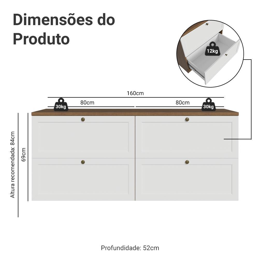 O Rack Vik da Madesa combina design clássico e elementos modernos, inspirado no estilo americano, criando um ambiente sofisticado e acolhedor.Composto por quatro gavetas amplas, o módulo pode ser instalado de forma suspensa, trazendo leveza e um toque contemporâneo ao ambiente. Além disso, oferece espaço ideal para acomodar TV de até 70 polegadas. As gavetas possuem corrediças que permitem abertura total, para você organizar tudo que precisa com muito mais facilidade.O acabamento de alta resistência da estrutura é no tom amadeirado Rustic e das frentes em Branco, possuindo uma textura suave ao toque. O destaque fica por conta dos puxadores ponto em ouro envelhecido, feitos com metal resistente, trazem personalidade e um charme único. O detalhe chanfrado das frentes forma molduras delicadas e atemporais.Medidas totais:- 84cm de altura- 160cm de largura- 52cm de profundidadeO que você recebe:- Dois Balcões com duas gavetas em cada- Manual de montagem e ferragensCódigo do produto: MDES0200426EÉ importante saber:- Material: MDP- Imagens meramente ilustrativas, a decoração não acompanha o produto.- A Madesa não disponibiliza serviço de montagem.- Não pode ser fixada em paredes de gesso acartonado (drywall), revestidas em PVC ou paredes de madeira.A Madesa possui compromisso com a sustentabilidade. Geramos energia limpa em nossa própria usina, priorizamos fornecedores responsáveis e utilizamos plástico reciclado em nossa produção. Além disso, reinserimos sobras no ciclo de reciclagem e investimos no desenvolvimento de nossos colaboradores e da comunidade.Garantia: Este produto conta com 1 ano de garantia total, sendo 3 meses de garantia legal e 9 meses de garantia contratual. A garantia cobre exclusivamente defeitos de fabricação e vícios ocultos. Não estão cobertos: problemas decorrentes de montagem incorreta, uso inadequado, exposição à umidade, calor ou luz solar direta, modificações no produto ou desgaste natural.