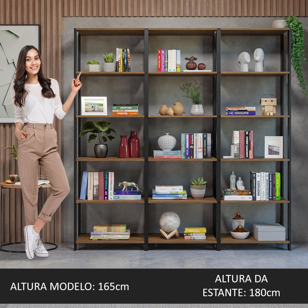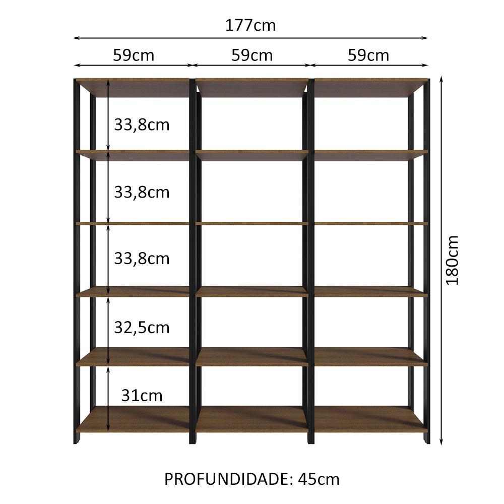 Esta Estante Multiuso vai transformar o seu espaço e melhorar a organização do seu ambiente.Com um design aberto, o acesso fácil aos objetos fica bem mais fácil. Esta versão inclui três módulos independentes, com múltiplas prateleiras que oferecem ótimo espaço de armazenamento.O acabamento combina os tons preto e amadeirado Rustic.Medidas totais:- 180 cm de altura- 177 cm de largura- 45 cm de profundidadeItens inclusos:- Três (3) Móveis de 59 cm de largura com cinco (5) prateleiras cadaCódigo do produto: MDES0300027KObs.: - Possui estruturas laterais em MDP com pintura em preto texturizado- Por segurança, é obrigatório fixar o móvel na parede- As imagens são meramente ilustrativas- A Madesa não oferece serviço de montagem- Acompanha ferragens e manual com todos os passos para a montagem do produtoA Madesa se dedica à sustentabilidade com várias iniciativas: temos uma usina própria para gerar energia que abastece uma de nossas fábricas. Selecionamos nossos fornecedores, priorizando aqueles que possuem um compromisso com a sustentabilidade e proteção do meio ambiente. Todo o plástico utilizado no setor produtivo é proveniente de reciclagem e as suas sobras são encaminhadas ao fornecedor que os recicla. Também investimos no desenvolvimento contínuo de nossos colaboradores e em ações educacionais que beneficiem a comunidade.
