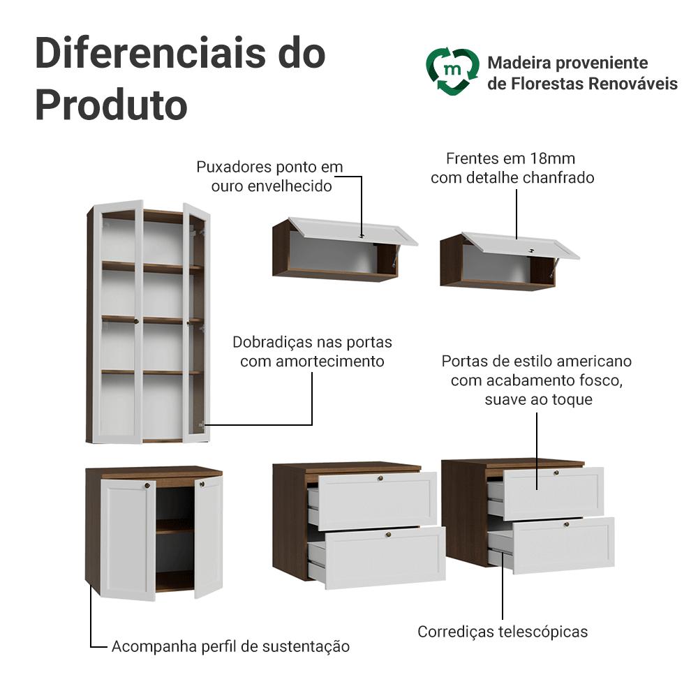 A nova estante da Linha Vik Madesa é a escolha ideal para quem deseja um móvel completo que combine estilo, funcionalidade e aproveitamento inteligente do espaço.O conjunto é composto por gavetas e armários amplos, um armário com portas de vidro, que pode ser usado como cristaleira ou livreiro. Essa combinação permite acomodar uma TV, organizar livros, louças e itens decorativos com facilidade. O acabamento da estrutura é no tom amadeirado Rustic e das frentes em Branco, possui alta resistência, trazendo um visual sofisticado e textura suave ao toque.A Linha Vik se destaca pelos detalhes que fazem toda a diferença: portas com molduras inspiradas no estilo americano, puxadores ponto em ouro envelhecido, dobradiças com amortecimento e gavetas com corrediças que permitem abertura total. Além disso, as portas basculantes possuem um sistema de pistão a gás, permanecem suspensas quando abertas, proporcionando mais segurança. Um móvel completo, que combina elegância e funcionalidade para valorizar cada detalhe da sua casa.O que você recebe:- Um Balcão com duas portas- Dois Balcões com duas gavetas em cada- Dois Armários Aéreos com porta basculante- Um Armário com duas portas de vidro- Manual de montagem e ferragensMedidas totais:- 225cm de altura- 230cm de largura- 52cm de profundidade nos balcões e 31cm nos aéreos e cristaleiraCódigo do produto: MDES0600016EÉ importante saber:- Material: MDP- Imagens meramente ilustrativas, a decoração não acompanha o produto.- A Madesa não disponibiliza serviço de montagemA Madesa possui compromisso com a sustentabilidade. Geramos energia limpa em nossa própria usina, priorizamos fornecedores responsáveis e utilizamos plástico reciclado em nossa produção. Além disso, reinserimos sobras no ciclo de reciclagem e investimos no desenvolvimento de nossos colaboradores e da comunidade.Garantia: Este produto conta com 1 ano de garantia total, sendo 3 meses de garantia legal e 9 meses de garantia contratual. A garantia cobre exclusivamente defeitos de fabricação e vícios ocultos. Não estão cobertos: problemas decorrentes de montagem incorreta, uso inadequado, exposição à umidade, calor ou luz solar direta, modificações no produto ou desgaste natural.