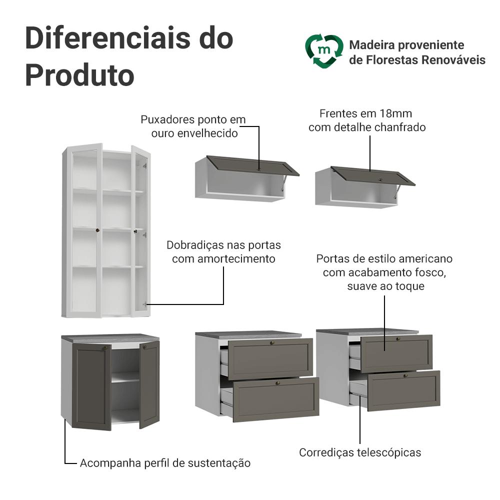 A nova estante da Linha Vik Madesa é a escolha ideal para quem deseja um móvel completo que combine estilo, funcionalidade e aproveitamento inteligente do espaço.O conjunto é composto por gavetas e armários amplos, um armário com portas de vidro, que pode ser usado como cristaleira ou livreiro. Essa combinação permite acomodar uma TV, organizar livros, louças e itens decorativos com facilidade. O acabamento da estrutura é Branco, das frentes em Cinza e da cristaleira em Branco também, possui alta resistência, trazendo um visual sofisticado e textura suave ao toque.A Linha Vik se destaca pelos detalhes: portas com molduras inspiradas no estilo americano, puxadores ponto em ouro envelhecido, dobradiças com amortecimento e gavetas com corrediças que permitem abertura total. Além disso, as portas basculantes possuem um sistema de pistão a gás, permanecem suspensas quando abertas, proporcionando mais segurança. Um móvel completo, que combina elegância e funcionalidade para valorizar cada detalhe da sua casa.O que você recebe:- Um Balcão com duas portas- Dois Balcões com duas gavetas em cada- Dois Armários Aéreos com porta basculante- Um Armário com duas portas de vidro- Manual de montagem e ferragensMedidas totais:- 225cm de altura- 230cm de largura- 52cm de profundidade nos balcões e 31cm nos aéreos e cristaleiraCódigo do produto: MDES060001M5É importante saber:- Material: MDP- Imagens meramente ilustrativas, a decoração não acompanha o produto.- A Madesa não disponibiliza serviço de montagemA Madesa possui compromisso com a sustentabilidade. Geramos energia limpa em nossa própria usina, priorizamos fornecedores responsáveis e utilizamos plástico reciclado em nossa produção. Além disso, reinserimos sobras no ciclo de reciclagem e investimos no desenvolvimento de nossos colaboradores e da comunidade.Garantia: Este produto conta com 1 ano de garantia total, sendo 3 meses de garantia legal e 9 meses de garantia contratual. A garantia cobre exclusivamente defeitos de fabricação e vícios ocultos. Não estão cobertos: problemas decorrentes de montagem incorreta, uso inadequado, exposição à umidade, calor ou luz solar direta, modificações no produto ou desgaste natural.