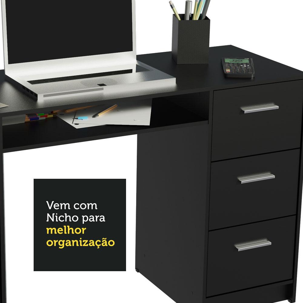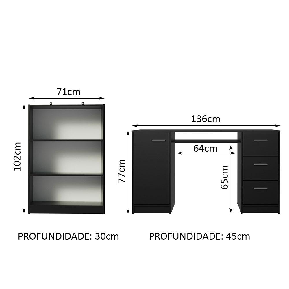 Uma opção feita na medida para organizar seu home office ou ambiente de estudos. Chegou o conjunto da Escrivaninha Alaska + Estante para livros 6907 da Madesa.A Escrivaninha possui tampo de madeira, três gavetas espaçosas com corrediças metálicas e um nicho abaixo do tampo, com abertura na parte de trás. Além disso, conta com uma porta com dobradiça metálica e espaço interno para guardar objetos. Pode ser usada como mesa de apoio ou para notebook e PC.Já a estante conta com três nichos bem distribuídos, ideais para organizar livros, revistas e objetos decorativos. Com ótima largura, é fabricada em MDP e possui suportes de fixação na parte superior, que proporcionam maior segurança.O acabamento dos móveis é preto, com algumas partes internas em pintura branca. É feito em Pintura Poliéster de alta resistência. Esse método oferece mais proteção ao móvel e é totalmente ecológico. Dessa forma, não agride o meio ambiente.Medidas totais da escrivaninha: 77 cm de altura x 136 cm de largura x 45 cm de profundidade.Medidas totais da estante: 102 cm de altura x 71 cm largura x 30 cm de profundidade.Imagens meramente ilustrativas. A decoração não acompanha o produto.Itens inclusos:- Uma (1) Escrivaninha com uma (1) porta e três (3) gavetas- Uma (1) Estante com três (3) nichosCódigo do produto: MDFC0200068N8NObs.: A Madesa não disponibiliza serviço de montagem. O produto segue com manual de instalação e todas as ferragens necessárias para a instalação.1 – O produto é novo ou usado?R.: Todos os produtos da Madesa são novos, enviados da nossa fábrica diretamente para as casas de nossos clientes.2 – O produto vem montado? Se não, vocês realizam a montagem?R.: A Madesa não disponibiliza serviço de montagem. Todos os produtos seguem com manual de instalação e as ferragens necessárias. Alguns produtos possuem vídeo explicando o passo a passo da montagem.3 – Vocês possuem loja física? Posso retirar meu produto em mãos?R.: Não possuímos loja física, apenas loja virtual. Confira as opções de envio ao colocar o seu CEP.4 – Qual é o valor do envio? Posso pagar separadamente?R.: O valor do envio é calculado com base no peso e volume do produto, e no CEP de destino. Você pode calcular o valor e prazo de entrega no simulador.5 – A Madesa entrega em todo Brasil? Como é feita a entrega?R.: Sim, entregamos no Brasil inteiro através de transportadoras parceiras.6 – O produto acompanha Nota Fiscal?R.: Sim, todos os produtos são entregues com suas respectivas notas fiscais.7 – Os produtos possuem garantia?R.: Sim. A Madesa oferece 3 meses de garantia para defeitos de fabricação.A Madesa se dedica à sustentabilidade com várias iniciativas: temos uma usina própria para gerar energia que abastece uma de nossas fábricas. Selecionamos nossos fornecedores, priorizando aqueles que possuem um compromisso com a sustentabilidade e proteção do meio ambiente. Todo o plástico utilizado no setor produtivo é proveniente de reciclagem e as suas sobras são encaminhadas ao fornecedor que os recicla. Também investimos no desenvolvimento contínuo de nossos colaboradores e em ações educacionais que beneficiem a comunidade.