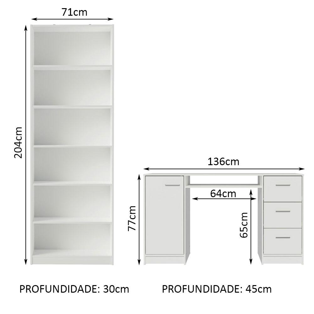 Chegou o conjunto que vai renovar seu home office ou ambiente de estudos. Confira o kit da Escrivaninha Alaska + Estante Livreiro 6908 da Madesa.A Estante conta com seis nichos super espaçosos e bem distribuídos. O espaço é perfeito para organizar os seus materiais, como livros, revistas e objetos decorativos. Fabricada em MDP com ótima espessura, possui suportes de fixação na parte superior, que proporcionam maior segurança.Já a Escrivaninha possui tampo de madeira, três gavetas espaçosas com corrediças metálicas e um nicho abaixo do tampo, com abertura na parte de trás. Além disso, conta com uma porta com dobradiça metálica e espaço interno para guardar objetos. Também pode ser usada como mesa de apoio ou para notebook e PC.O acabamento dos móveis é branco, feito em Pintura Poliéster de alta resistência. Esse método oferece mais proteção ao móvel e é totalmente ecológico. Dessa forma, não agride o meio ambiente.Medidas totais da escrivaninha: 77 cm de altura x 136 cm de largura x 45 cm de profundidade.Medidas totais da estante: 204 cm de altura x 71 cm largura x 30 cm de profundidade.Imagens meramente ilustrativas. A decoração não acompanha o produto.Itens inclusos:- Uma (1) Escrivaninha com uma (1) porta e três (3) gavetas- Uma (1) Estante com seis (6) nichosCódigo do produto: MDFC0200070909Obs.: A Madesa não disponibiliza serviço de montagem. O produto segue com manual de instalação e todas as ferragens necessárias para a instalação.1 – O produto é novo ou usado?R.: Todos os produtos da Madesa são novos, enviados da nossa fábrica diretamente para as casas de nossos clientes.2 – O produto vem montado? Se não, vocês realizam a montagem?R.: A Madesa não disponibiliza serviço de montagem. Todos os produtos seguem com manual de instalação e as ferragens necessárias. Alguns produtos possuem vídeo explicando o passo a passo da montagem.3 – Vocês possuem loja física? Posso retirar meu produto em mãos?R.: Não possuímos loja física, apenas loja virtual. Confira as opções de envio ao colocar o seu CEP.4 – Qual é o valor do envio? Posso pagar separadamente?R.: O valor do envio é calculado com base no peso e volume do produto, e no CEP de destino. Você pode calcular o valor e prazo de entrega no simulador.5 – A Madesa entrega em todo Brasil? Como é feita a entrega?R.: Sim, entregamos no Brasil inteiro através de transportadoras parceiras.6 – O produto acompanha Nota Fiscal?R.: Sim, todos os produtos são entregues com suas respectivas notas fiscais.7 – Os produtos possuem garantia?R.: Sim. A Madesa oferece 3 meses de garantia para defeitos de fabricação.A Madesa se dedica à sustentabilidade com várias iniciativas: temos uma usina própria para gerar energia que abastece uma de nossas fábricas. Selecionamos nossos fornecedores, priorizando aqueles que possuem um compromisso com a sustentabilidade e proteção do meio ambiente. Todo o plástico utilizado no setor produtivo é proveniente de reciclagem e as suas sobras são encaminhadas ao fornecedor que os recicla. Também investimos no desenvolvimento contínuo de nossos colaboradores e em ações educacionais que beneficiem a comunidade.