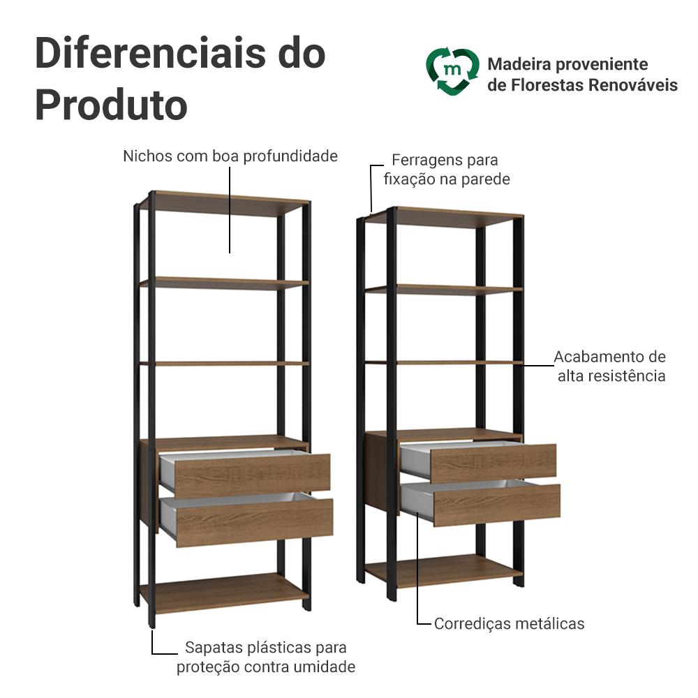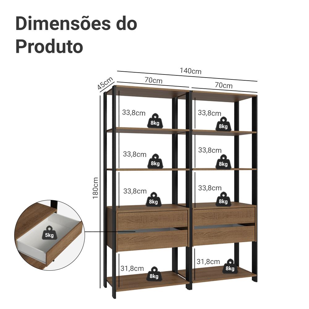 Precisa de um móvel versátil e funcional para otimizar seu escritório ou sala de estar? Apresentamos a Estante Organizadora Multiuso da Madesa.Com oito prateleiras amplas, ela acomoda livros, pastas, documentos e itens decorativos, proporcionando um ambiente organizado e elegante.Além disso, conta com quatro gavetas práticas e espaçosas, perfeitas para guardar materiais de escritório, cabos e objetos menores, garantindo ainda mais praticidade.O acabamento de alta resistência é moderno e elegante, combinando os tons amadeirado Rustic e preto.Medidas totais:- 180 cm de altura- 140 cm de largura- 45 cm de profundidadeO que você recebe:- Duas (2) Estantes abertas de 70 cm com duas (2) gavetas e quatro (4) prateleiras cada- Ferragens e manual de montagemCódigo do produto: MDFC0200297KÉ bom saber:- As imagens são meramente ilustrativas- A Madesa não oferece serviço de montagem- Por segurança, é obrigatório fixar o móvel na parede- Estruturas laterais em MDP com pintura em preto texturizadoA Madesa se dedica à sustentabilidade com várias iniciativas: temos uma usina própria para gerar energia que abastece uma de nossas fábricas. Selecionamos nossos fornecedores, priorizando aqueles que possuem um compromisso com a sustentabilidade e proteção do meio ambiente. Todo o plástico utilizado no setor produtivo é proveniente de reciclagem e as suas sobras são encaminhadas ao fornecedor que os recicla. Também investimos no desenvolvimento contínuo de nossos colaboradores e em ações educacionais que beneficiem a comunidade.