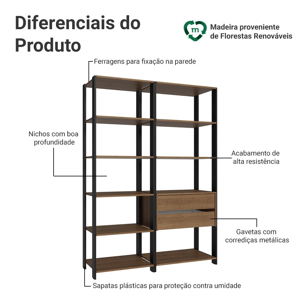 Se você precisa de um móvel prático para otimizar seu escritório, a Estante Multiuso da Madesa é a solução ideal para manter tudo organizado.Com prateleiras bem distribuídas e duas gavetas espaçosas, o conjunto oferece espaço para livros, pastas, documentos, caixas organizadoras e itens decorativos. É perfeito para deixar tudo visível e acessível no dia a dia.O acabamento em tom amadeirado Rustic de alta resistência traz um toque moderno ao ambiente.Medidas totais:- 180 cm de altura- 129 cm de largura- 45 cm de profundidadeInformações técnicas:- Material: MDP- Peso suportado: 82kgO que você recebe:- Duas estantes multiuso com cinco prateleiras com oitro prateleiras e duas gavetasCódigo do produto: MDFC0200317KÉ importante saber:- Imagens meramente ilustrativas, a decoração não acompanha o produto- A Madesa não disponibiliza serviço de montagem- O produto segue com manual de instalação e todas as ferragens necessárias para sua montagem- Por segurança, é obrigatório fixar o móvel na paredeA Madesa possui compromisso com a sustentabilidade. Geramos energia limpa em nossa própria usina, priorizamos fornecedores responsáveis e utilizamos plástico reciclado em nossa produção. Além disso, reinserimos sobras no ciclo de reciclagem e investimos no desenvolvimento de nossos colaboradores e da comunidade.Garantia: Este produto conta com 1 ano de garantia total, sendo 3 meses de garantia legal e 9 meses de garantia contratual. A garantia cobre exclusivamente defeitos de fabricação e vícios ocultos. Não estão cobertos: problemas decorrentes de montagem incorreta, uso inadequado, exposição à umidade, calor ou luz solar direta, modificações no produto ou desgaste natural.
