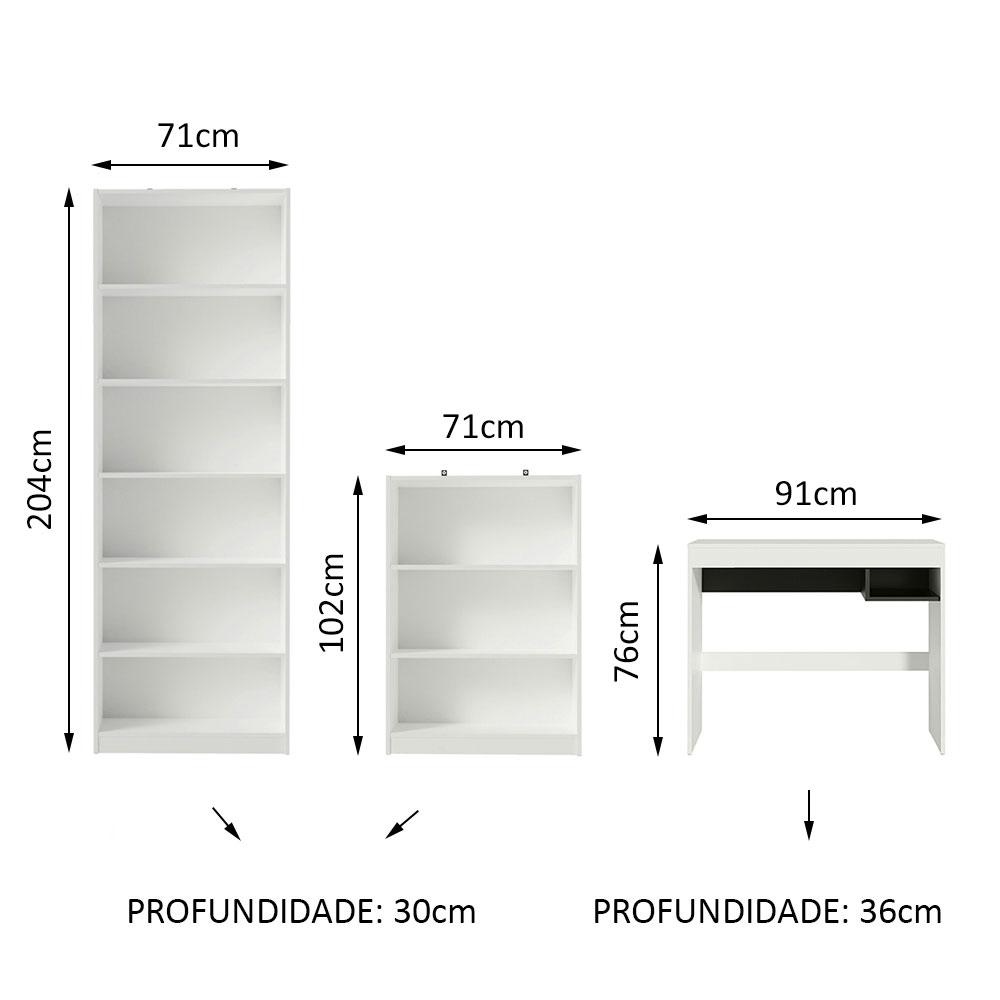 O conjunto da Escrivaninha Rubi + Estantes Livreiro 6908 e 6907 da Madesa é perfeito para renovar seu escritório ou ambiente de estudo.Compacta na medida certa, a Escrivaninha Rubi conta com tampo de madeira e um nicho na parte inferior, além de acabamento frontal e traseiro para garantir melhor fixação e firmeza. Pode ser utilizada como escrivaninha ou mesa para notebook.As estantes conta com nichos espaçosos e bem distribuídos. São a opção ideal para organizar todos os seus materiais, como livros, revistas e objetos decorativos. Também possuem suportes de fixação na parte superior, que proporcionam maior segurança.O acabamento dos móveis é branco, com exceção do nicho da mesa, que é preto. O processo é feito em Pintura Poliéster de alta resistência, método que oferece mais proteção ao móvel e é totalmente ecológico.Imagens meramente ilustrativas. A decoração não acompanha o produto.Itens inclusos:- Uma (1) Escrivaninha com 76 cm de altura x 91 cm de largura x 36 cm de profundidade.- Uma (1) Estante com 204 cm de altura x 71 cm largura x 30 cm de profundidade.- Uma (1) Estante com 102 cm de altura x 71 cm largura x 30 cm de profundidade.Código do produto: MDFC03000173Obs.: A Madesa não disponibiliza serviço de montagem. O produto segue com manual de instalação e todas as ferragens necessárias para a instalação.1 – O produto é novo ou usado?R.: Todos os produtos da Madesa são novos, enviados da nossa fábrica diretamente para as casas de nossos clientes.2 – O produto vem montado? Se não, vocês realizam a montagem?R.: A Madesa não disponibiliza serviço de montagem. Todos os produtos seguem com manual de instalação e as ferragens necessárias. Alguns produtos possuem vídeo explicando o passo a passo da montagem.3 – Vocês possuem loja física? Posso retirar meu produto em mãos?R.: Não possuímos loja física, apenas loja virtual. Confira as opções de envio ao colocar o seu CEP.4 – Qual é o valor do envio? Posso pagar separadamente?R.: O valor do envio é calculado com base no peso e volume do produto, e no CEP de destino. Você pode calcular o valor e prazo de entrega no simulador.5 – A Madesa entrega em todo Brasil? Como é feita a entrega?R.: Sim, entregamos no Brasil inteiro através de transportadoras parceiras.6 – O produto acompanha Nota Fiscal?R.: Sim, todos os produtos são entregues com suas respectivas notas fiscais.7 – Os produtos possuem garantia?R.: Sim. A Madesa oferece 3 meses de garantia para defeitos de fabricação.A Madesa se dedica à sustentabilidade com várias iniciativas: temos uma usina própria para gerar energia que abastece uma de nossas fábricas. Selecionamos nossos fornecedores, priorizando aqueles que possuem um compromisso com a sustentabilidade e proteção do meio ambiente. Todo o plástico utilizado no setor produtivo é proveniente de reciclagem e as suas sobras são encaminhadas ao fornecedor que os recicla. Também investimos no desenvolvimento contínuo de nossos colaboradores e em ações educacionais que beneficiem a comunidade.