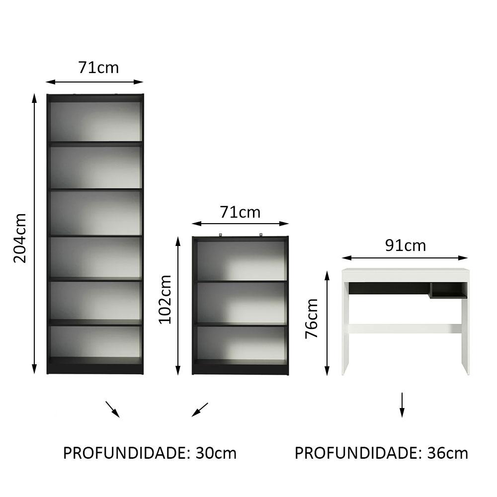 O conjunto da Escrivaninha Rubi + Estantes Livreiro 6908 e 6907 da Madesa é perfeito para renovar seu escritório ou ambiente de estudo.Compacta na medida certa, a Escrivaninha Rubi conta com tampo de madeira e um nicho na parte inferior, além de acabamento frontal e traseiro para garantir melhor fixação e firmeza. Pode ser utilizada como escrivaninha ou mesa para notebook.As estantes conta com nichos espaçosos e bem distribuídos. São a opção ideal para organizar todos os seus materiais, como livros, revistas e objetos decorativos. Também possuem suportes de fixação na parte superior, que proporcionam maior segurança.O acabamento da escrivaninha combina os tons branco e preto. Já a as estantes possuem pintura toda branca. O processo é feito em Poliéster Protetor, método ecológico e que oferece resistência ao móvel.Imagens meramente ilustrativas. A decoração não acompanha o produto.Itens inclusos:- Uma (1) Escrivaninha com 76 cm de altura x 91 cm de largura x 36 cm de profundidade.- Uma (1) Estante com 204 cm de altura x 71 cm largura x 30 cm de profundidade.- Uma (1) Estante com 102 cm de altura x 71 cm largura x 30 cm de profundidade.Código do produto: MDFC03000177Obs.: A Madesa não disponibiliza serviço de montagem. O produto segue com manual de instalação e todas as ferragens necessárias para a instalação.1 – O produto é novo ou usado?R.: Todos os produtos da Madesa são novos, enviados da nossa fábrica diretamente para as casas de nossos clientes.2 – O produto vem montado? Se não, vocês realizam a montagem?R.: A Madesa não disponibiliza serviço de montagem. Todos os produtos seguem com manual de instalação e as ferragens necessárias. Alguns produtos possuem vídeo explicando o passo a passo da montagem.3 – Vocês possuem loja física? Posso retirar meu produto em mãos?R.: Não possuímos loja física, apenas loja virtual. Confira as opções de envio ao colocar o seu CEP.4 – Qual é o valor do envio? Posso pagar separadamente?R.: O valor do envio é calculado com base no peso e volume do produto, e no CEP de destino. Você pode calcular o valor e prazo de entrega no simulador.5 – A Madesa entrega em todo Brasil? Como é feita a entrega?R.: Sim, entregamos no Brasil inteiro através de transportadoras parceiras.6 – O produto acompanha Nota Fiscal?R.: Sim, todos os produtos são entregues com suas respectivas notas fiscais.7 – Os produtos possuem garantia?R.: Sim. A Madesa oferece 3 meses de garantia para defeitos de fabricação.A Madesa se dedica à sustentabilidade com várias iniciativas: temos uma usina própria para gerar energia que abastece uma de nossas fábricas. Selecionamos nossos fornecedores, priorizando aqueles que possuem um compromisso com a sustentabilidade e proteção do meio ambiente. Todo o plástico utilizado no setor produtivo é proveniente de reciclagem e as suas sobras são encaminhadas ao fornecedor que os recicla. Também investimos no desenvolvimento contínuo de nossos colaboradores e em ações educacionais que beneficiem a comunidade.