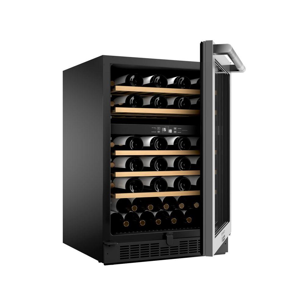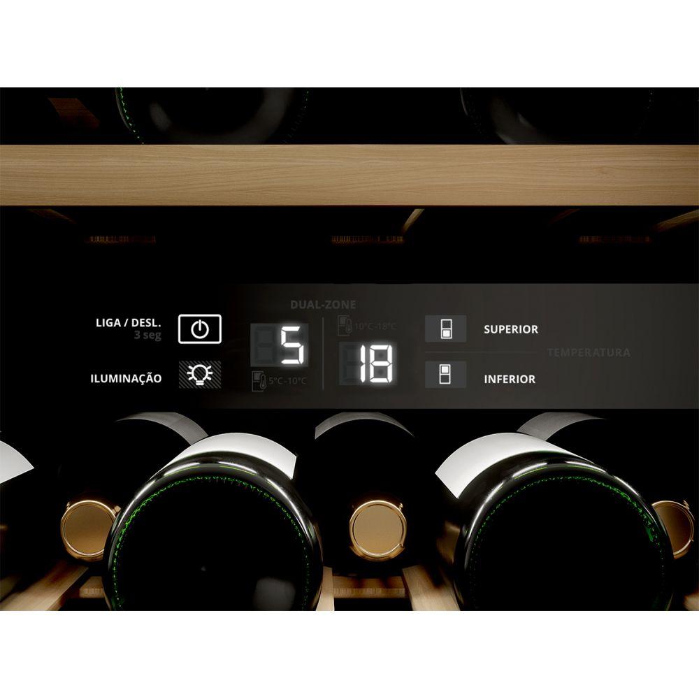 Adega Climatizada Gourmand Brastemp Dual Zone 51 Garrafas 110V BZB51AEANAA Adega Brastemp Gourmand BZB51AE com capacidade para 51 garrafas possui a tecnologia Dual Zone, dois compartimentos com controle de temperatura independentes. Conta também com Painel Eletrônico Touch, prateleiras de madeira, puxador metálico e portas de vidro triplo. Dual Zone são dois compartimentos destintos com controle de temperatura independentes para armazenar diferentes tipos de vinho ao mesmo tempo. Com o painel eletrônico touch você pode programar e visualizar a temperatura dos dois compartimentos independentes da adega, além de controlar a iluminação interna.Suas prateleira em madeira são mais resistentes ás vibrações que interferem na conservação do vinho.Seu puxador horizontal Gourmand feito em aço trazendo maior sofisticação e beleza ao produto!Especificações TécnicasDimensões aprox. do Produto: Largura: 60,5 x Altura: 87,5 x Profundidade: 66,7 cmDim. nicho embutir (L x A x P) cm: 80,5 x 93,00 x 74,03Cor: InoxPeso (kg): 56,00Capacidade: Acima de 48 garrafasCapacidade Total (Litros): 152Dual Zone: SimClimatizada: SimCapacidade de Garrafas: 51Material da Porta: Porta em vidro e aço inoxMaterial Prateleiras: Prateleiras em madeiraDisplay Eletrônico: SimQuantidade de portas: 01Quantidade de Prateleiras: 05Luz interna: SimLuz com LEDs: SimControle de temperatura eletrônico: SimPés Niveladores: SimIndicador de porta aberta: NãoPode ser embutida: SimVoltagem: 110VGarantia: 1 anoMarca: Brastemp Ref: BZB51AEANA
