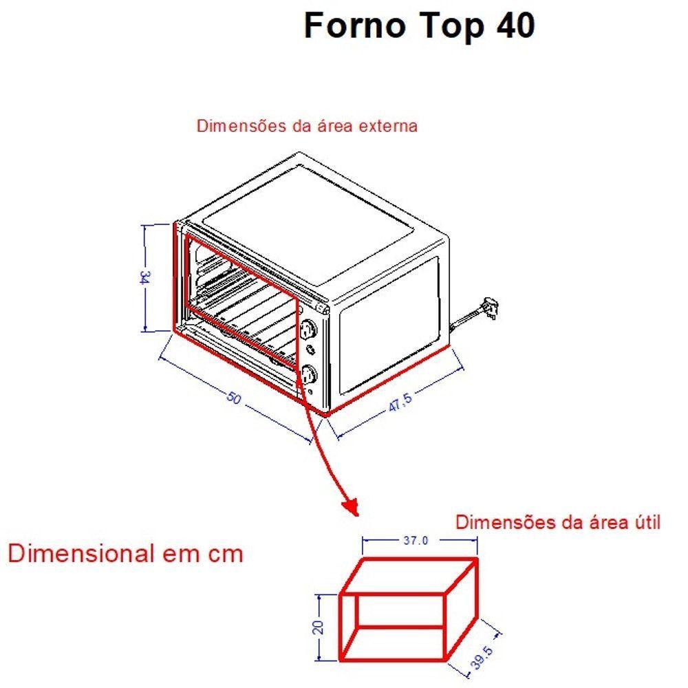 Forno Elétrico De Bancada 40 Litros Nardelli Top 40 Black Preto 110VDescubra a versatilidade com nosso Forno de Bancada de 40 Litros. Prepare refeicoes deliciosas e economize espaco na sua cozinha.Forno de Bancada Atencao escolha a voltagem do produto antes de finalizar a compra Caracteristicas Capacidade 40 Litros Timer de 120 minutos Termostato ate 300 graus Bandeja para residuos Grade Interna Luz piloto Indica se o forno esta ligado Grill e Dourador Interior Easy Clean, Esmaltado Isolamento termico Compacto, pratico e moderno Especificacoes Tecnicas Tensao 110V ou 220V, a voltagem deve ser escolhida e selecionada no ato da compra Corrente 15 A para 127 V e 8 A para 220 V Frequencia 60 Hz Potencia resistencia Superior 700 W Potencia resistencia Inferior 1000 W Potencia total 1700 W Consumo 1,2 kWh Tomada para fornos 220 V devem ser de 10 A Tomada para fornos 127 V devem ser de 20 A Atencao Padroes especificados e de acordo com as normas do Inmetro Dimensoes externas do produto A 34 cm x L 50 cm x P 47,5 cm Dimensoes internas do produto A 20 cm x L 37 cm x P 39,5 cm Espaco interno 40 Litros Peso 12,8 kg Garantia de Fabrica 12 meses Instalacao por conta do cliente Imagens meramente ilustrativas