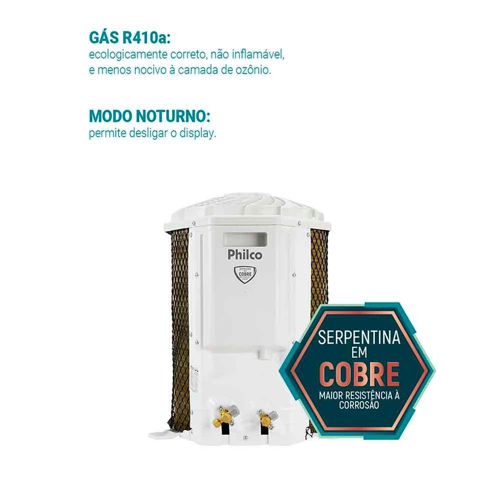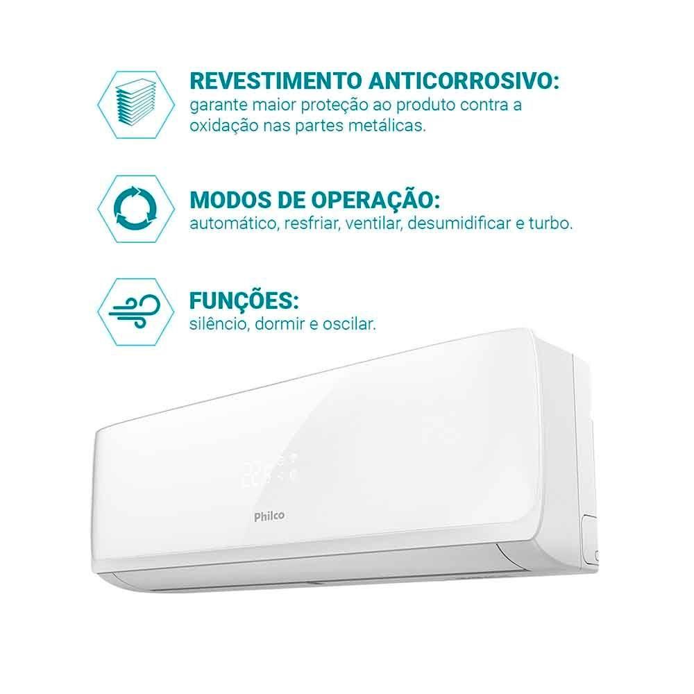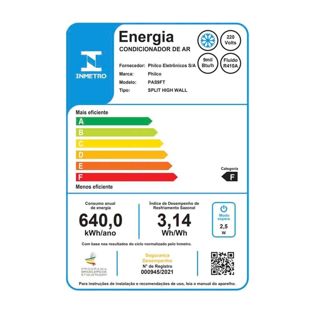 Ar Condicionado Split Hi Wall Philco 9.000 BTUs Frio PAS9FT-2 - 220V Conforto, eficiência e economia no seu dia a dia!O Ar Condicionado Split Philco PAS9FT-2 de 9.000 BTUs é ideal para manter ambientes de até 15 m² sempre frescos, com baixo consumo de energia, operação silenciosa e design moderno. Um modelo que entrega ótimo custo-benefício, com desempenho confiável e funções completas para seu bem-estar.Principais BenefíciosCapacidade de 9.000 BTUs: Ideal para quartos, escritórios e pequenos ambientes.Gás Refrigerante R-410A: Ecológico, não inflamável e não agride a camada de ozônio.Serpentina em Cobre: Garante maior durabilidade e resistência ao aparelho.Função Turbo: Resfria o ambiente rapidamente.Função Silencioso (Silent): Perfeito para dormir, relaxar ou estudar sem ruído.Oscilação Automática (Swing): Distribuição uniforme do ar.Timer 24h e Função Sleep: Comodidade e economia durante a noite.Auto Restart: Retoma configurações após quedas de energia.Filtro lavável antibacteriano e antipó: Mais saúde e facilidade na limpeza.Pintura Anticorrosiva: Proteção extra contra oxidação e maresia.Botão de Emergência: Permite ligar o aparelho mesmo sem controle remoto.Modos de operação: Esfriar, Ventilar, Desumidificar, Automático.Controle de ventilação: Alto, Médio, Baixo e Automático.Controle de temperatura digital: De 16°C a 32°C.Especificações TécnicasCapacidade de Refrigeração: 9.000 BTU/hCiclo: FrioGás Refrigerante: R-410A (Ecológico)Classificação Energética (INMETRO): FPotência Consumida: 880WConsumo de energia: 640 kWh/mêsFrequência: 60HzTensão: 220VSerpentina: CobreTubulação para conexão: 1/4” e 3/8”Vazão de ar máxima: 500 m³/hNível de Ruído – Unidade Interna: 40 dB (A)Nível de Ruído – Unidade Externa: 55 dB (A)Tipo: Hi WallCompressor: RotativoVolumes de embalagem: 2Filtros: Anti-bactéria e anti-fungosCódigo do Modelo: PAS9FT-2Código da Evaporadora: 96662835Código da Condensadora: 96662836Dimensões Evaporadora (A x L x P): 21 x 81,1 x 27 cmDimensões Condensadora (A x L x P): 53,6 x 38 x 47 cmRecomendações de Instalação: Tubulação adequada, tomada 220V, aterramento correto.Garantia: 12 meses (válida para instalação com profissional credenciado)
