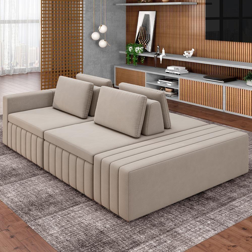 Sofá Ilha Com Puff Para Sala Living 265cm Amber M03 Veludo Bege - Lyam Decor