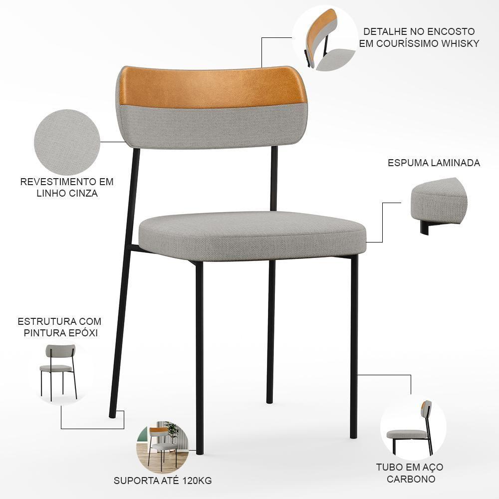 Kit 06 Cadeira Decorativa Estofada Para Sala De Jantar Melina L02 Linho Cinza Couríssimo Whisky - Lyam Decor