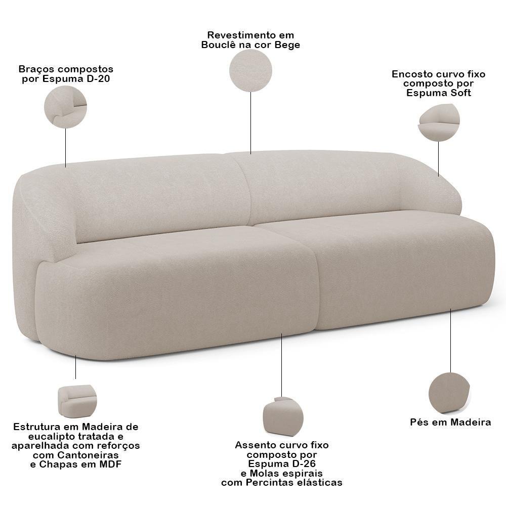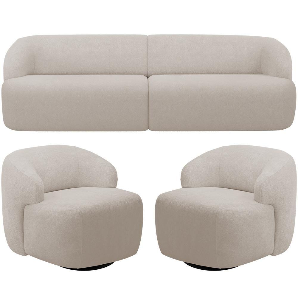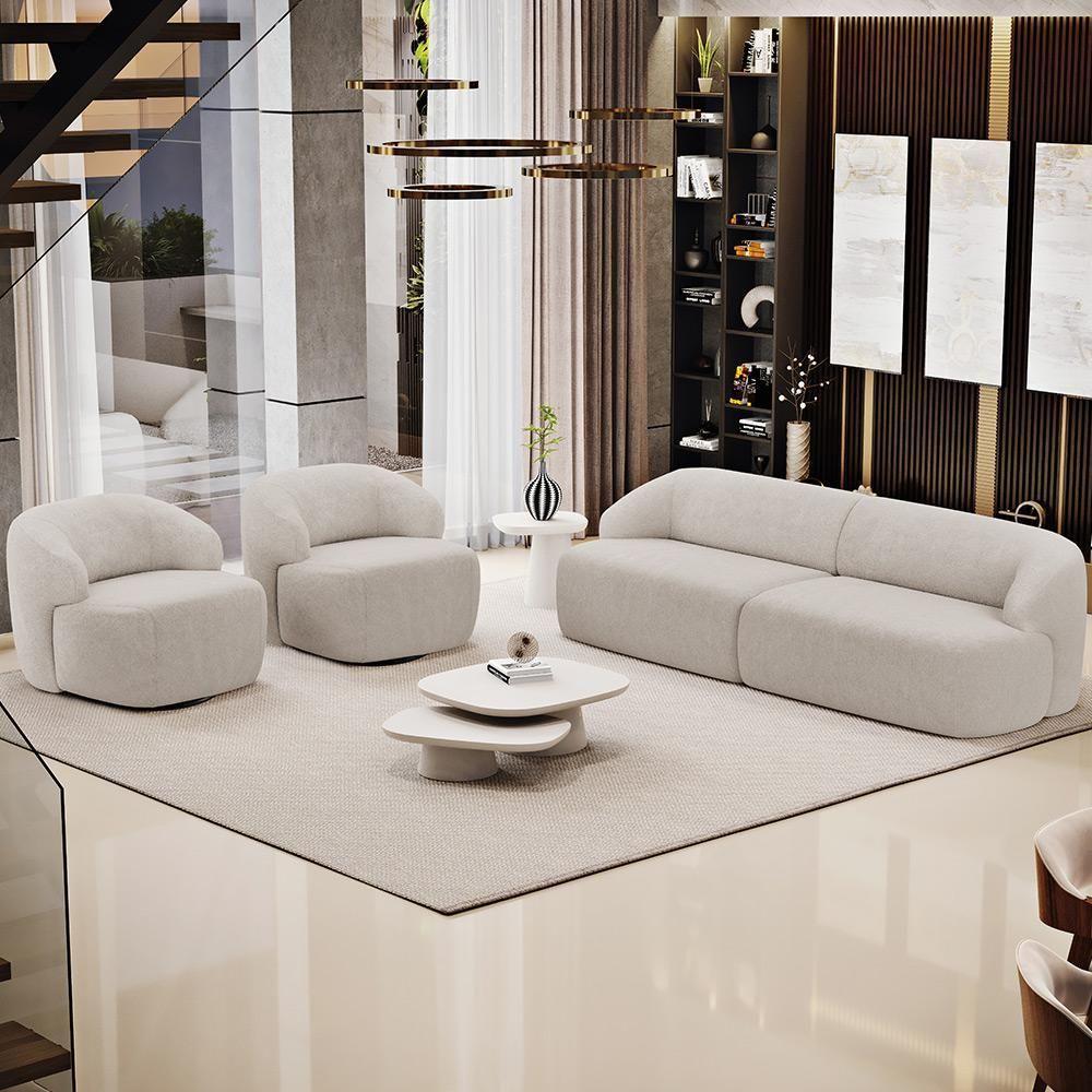 Sofá 3 Lugares Curvo Orgânico Com 02 Poltronas Living 220cm Barolo L06 Bouclê Bege