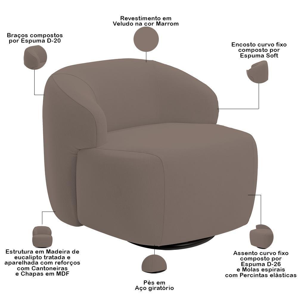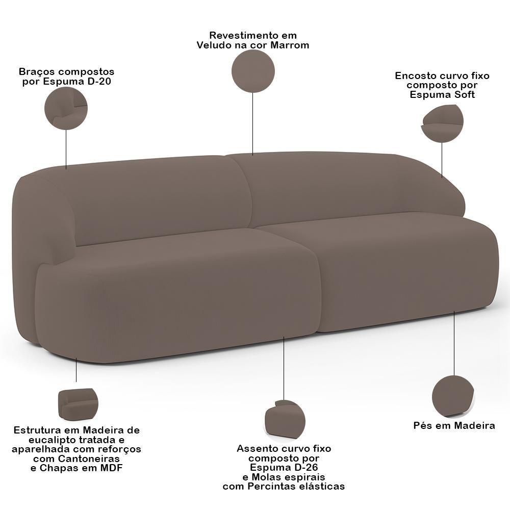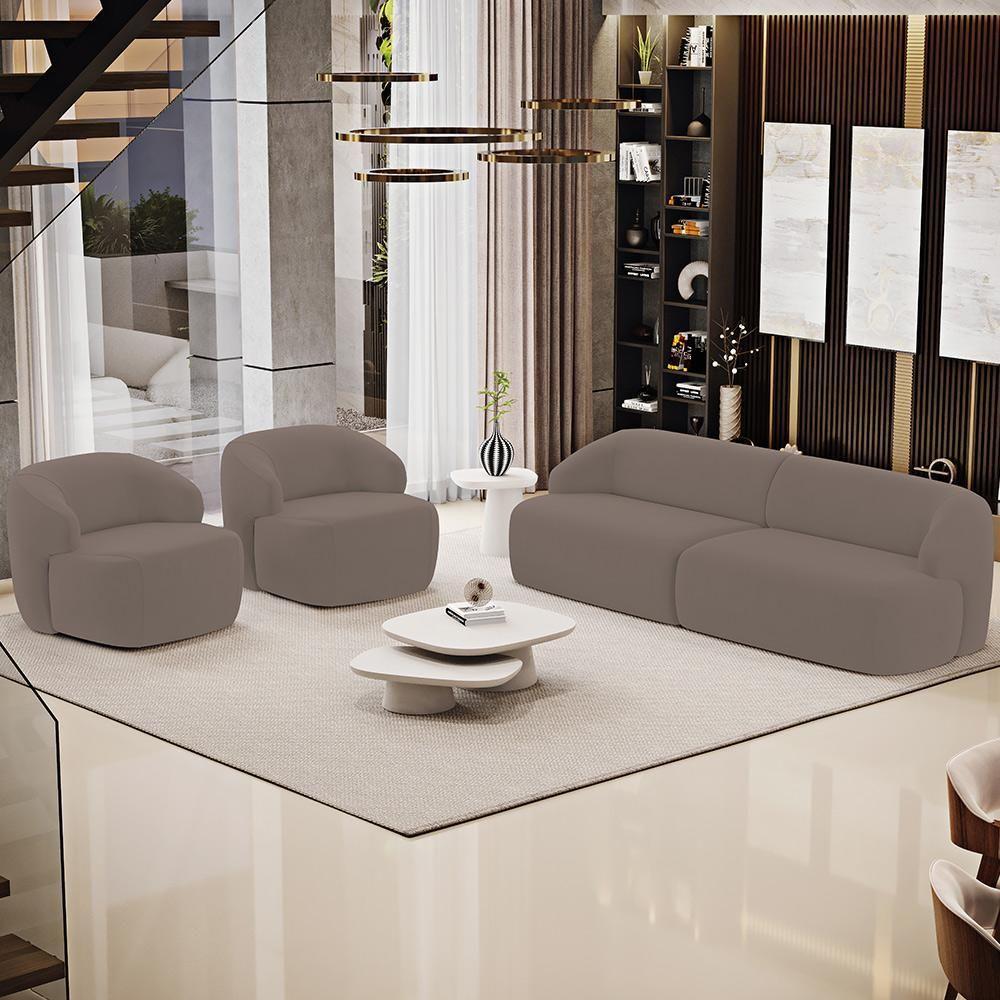 Sofá 3 Lugares Curvo Orgânico Com 02 Poltronas Living 220cm Barolo L06 Veludo Marrom