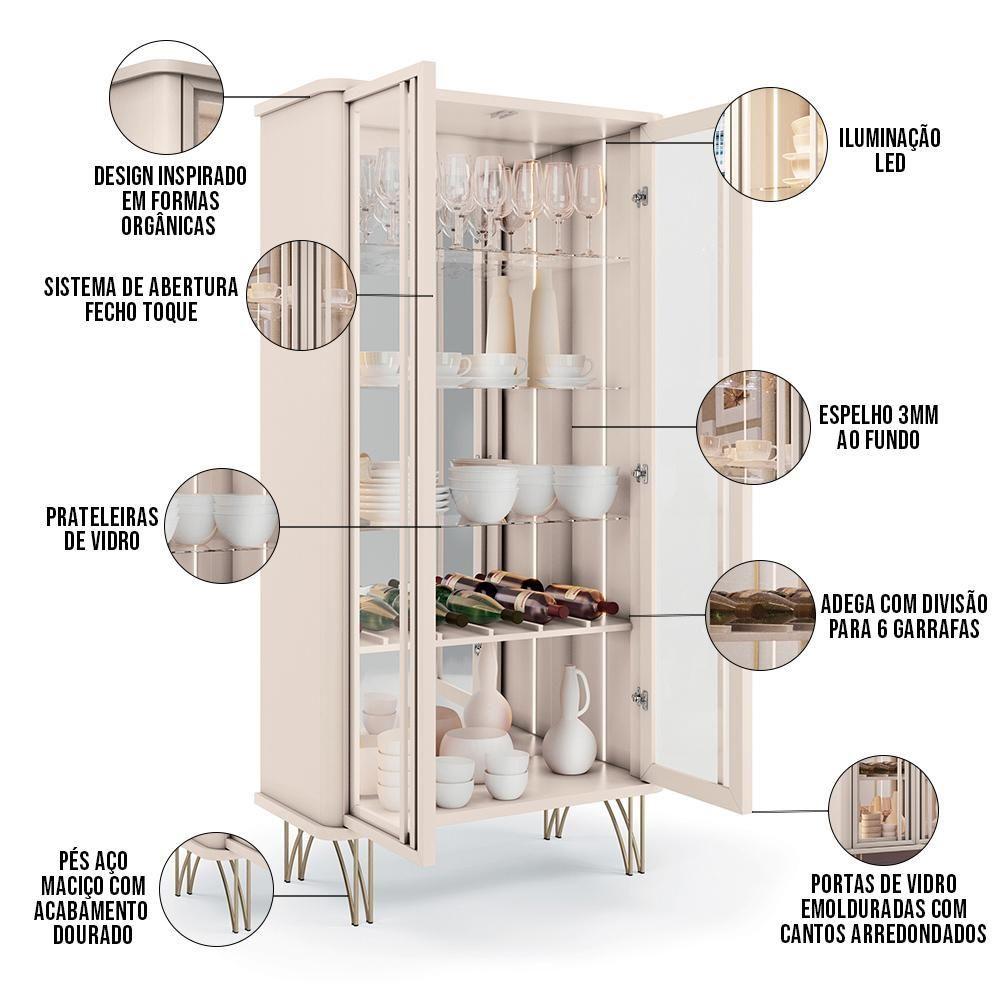 Kit Aparador Buffet Bar Living Santiago Com Cristaleira Adega Síria B01 Off White - LyamO Kit perfeito para sua sala de jantar acaba de chegar! Com acabamentos impecáveis, torna o espaço mais elegante e garante grande destaque para a composição dos móveis na ambientação. Na cristaleira, o espelho ao fundo e iluminação led, expressa sofisticação e modernidade, que expõe com ainda mais graciosidade as louças, cristais, taças e decorações em geral. O Buffet oferecendo amplo espaço para organização de louças, talheres e outros objetos, confere organização e praticidade! O design orgânico arredondado mesclado com o estilo industrial é uma opção moderna que traz leveza e harmonia ao ambiente. Os pés em aço com acabamento dourado conferem um toque de luxo e requinte, contrastando com a transparência das portas de vidro. Pode ser disposta na sala de jantar, de estar, cozinha, escritório ou até em corredores e espaços de circulação, aposta perfeita para quem deseja inovar sem erro!Dimensões do Buffet (L x A x P)220 x 75 x 45 cmMedidas Internas do Buffet:Altura das portas: 56 cmLargura das portas centrais: 54,5 cmLargura das portas extremas: 42,5 cmCaracterísticas Buffet:Estrutura em MDP e MDF de 15mm.Produto na cor Off White com acabamento em impressão UV Alto Brilho.04 Portas dobradiças laterais.02 Prateleiras em MDF 15mm.Puxadores em alumínio com acabamento dourado.Sistema de amortecimento leve para portas.Pés em aço maciço 3/8 com acabamento dourado.Suporta até 30 kg distribuídos.Dimensões da Cristaleira (L x A x P)90 x 180 x 41,5 cmMedidas Internas Cristaleira:Altura das prateleiras: 30 cmLargura da prateleiras superiores: 82,5 cmProfundidade das prateleiras superiores: 29 cmAltura da prateleira inferior: 33,5 cmLargura da prateleira inferior: 84 cmAltura da adega: 30 cmProfundidade da adega: 28,5 cmCaracterísticas Cristaleira:Estrutura em MDF 15 e 25mm.Produto na cor Off White com acabamento em impressão UV Alto Brilho.02 Portas de vidro emolduradas.01 Prateleira em MDF 15mm.03 Prateleiras de vidro 6mm.Adega com divisória para 6 garrafas.Espelho de 3mm ao fundo.Sistema de abertura fecho toque.Iluminação LED nas laterais.Pés em aço maciço 3/8 com acabamento dourado.Suporta até 5 kg por prateleira.Recomendação de Limpeza: Recomenda-se limpar o produto com flanela ou pano macio levemente umidecido, não utilizar produtos abrasivos, desengordurantes, álcool ou solvente. Mantê-lo em lugar livre de umidade e/ou exposição direta ao sol.Observações importantes:- Produto para uso residencial em ambiente interno, não devendo ficar exposto diretamente ao sol, calor e umidade excessivos.- Pode haver alguma diferença de tonalidade entre a imagem e o produto real, por conta do tratamento de imagens e a calibração de cores do seu monitor.- As imagens são meramente ilustrativas, não acompanham objetos de decoração e eletrônicos.- Ao receber a mercadoria, o cliente deve verificar as condições da embalagem, caso haja alguma não assine o de .- Montagem, desmontagem e outras instalações serão de responsabilidade do cliente. Não nos responsabilizamos, no ato da , por subir escadas/elevadores ou pelo por guincho em apartamentos. Eventuais despesas são de responsabilidade do comprador.- Confira as dimensões do produto e certifique-se de que passará normalmente por supostos elevadores, portas, escadas e/ou corredores de sua residência.