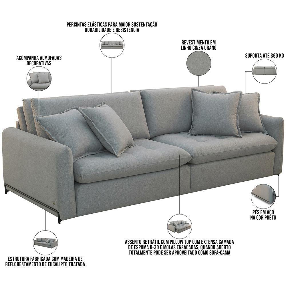 Sofá Cama Retrátil Para Sala De Estar 3 Lugares 210cm Lee T03 Linho Cinza Urano - Lyam Decor