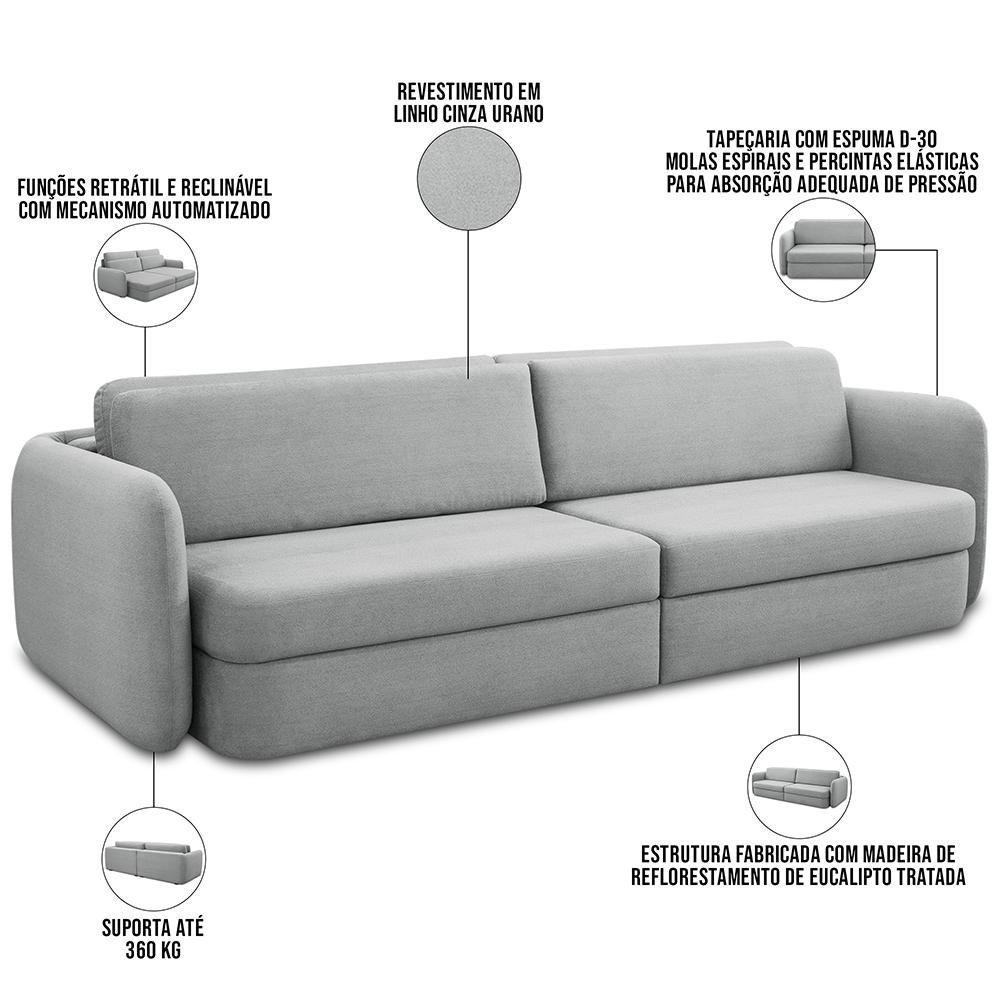 Sofá Retrátil Reclinável Para Sala Living 4 Lugares Jacob 274cm T03 Linho Cinza Urano - Lyam Decor
