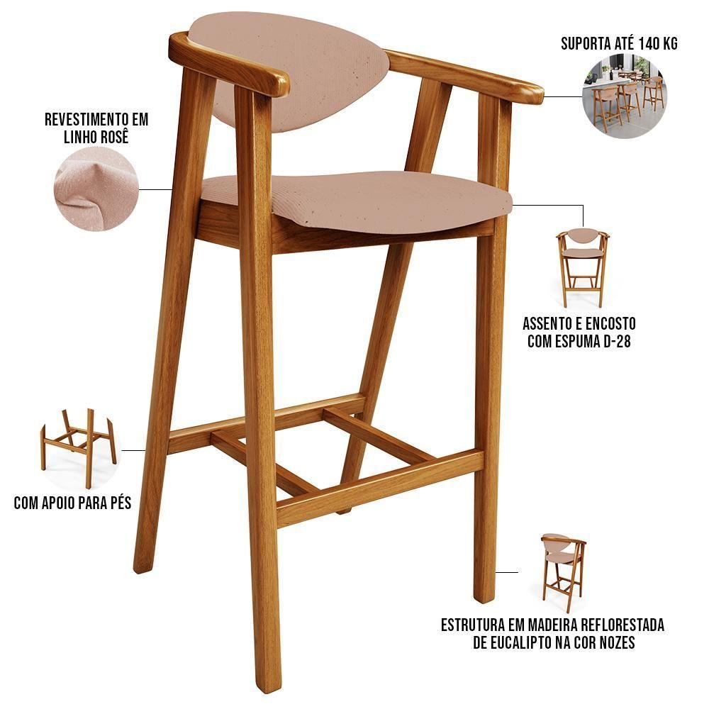 Kit 06 Banquetas Alta Para Cozinha Bancada Bar Sala De Jantar Fixa Cecília L02 Linho Rosê - LyamA melhor escolha para os momentos de confraternização no aconchego da sua casa, acaba de chegar! O Kit 06 Banquetas Altas Cecília vem com a personalidade e elegância que sua decoração merece! É ideal desde refeições rápidas, até um Happy Hour com os amigos, família. Seu design único valoriza o ambiente, sem deixar pra trás a beleza e qualidade! Para deixar a sua área gourmet mais aconchegante, ela possui assento e encosto estofados, confeccionados com materiais de excelente qualidade, e extremamente resistentes.Possui altura ideal, garantindo o encaixe perfeito no ambiente, otimizando seu espaço e promovendo máximo conforto. Pode ser usada em bancada, cozinha americana, home bar, ou área gourmet! As possibilidades são infinitas e as combinações ficarão extremamente elegantes. Adquira já a sua!Dimensões do produto (L x A x P)51 x 102 x 47 cmMedidas Internas:Altura do encosto: 22 cmAltura total do encosto: 33 cmLargura do encosto: 41 cmAltura do assento: 4,5 cmAltura do chão ao braço: 88 cmProfundidade do assento: 46,5 cmLargura do assento: 44 cmAltura interna do braço: 18 cmAltura do chão ao assento: 70 cmAltura do chão ao apoio de pés: 30 cmAltura do apoio de pés: 4,5 cmLargura interna do apoio de pés: 27 cmCaracterísticas:Estrutura em madeira de reflorestamento de eucalipto vermelho tratado.Revestimento em Linho na cor Rosê.Assento com espuma D-28.Encosto com espuma D-28.Peso suportado: Até 140 kg.Estrutura de Madeira na cor Nozes.Produto entregue montado.- Por se tratar de estofado as medidas podem ter uma pequena variação de até 3 cm.- A tonalidade do produto real poderá ter ligeira variação devido o lote de tecidos.- A limpeza deve ser feita com pano levemente umedecido em água limpa, sem esfregar, não utilizar produtos abrasivos, desengordurantes, álcool ou solvente.- Nunca sentar nos braços ou encosto do produto.Observações importantes:Produto para uso residencial em ambiente interno, não devendo ficar exposto diretamente ao sol, calor e umidade excessivos.Pode haver alguma diferença de tonalidade entre a imagem e o produto real, por conta do tratamento de imagens e a calibração de cores do seu monitor.As imagens são meramente ilustrativas, não acompanham objetos de decoração e eletrônicos.Ao receber a mercadoria, o cliente deve verificar as condições da embalagem, caso haja alguma não assine o de .Montagem, desmontagem e outras instalações serão de responsabilidade do cliente. Não nos responsabilizamos, no ato da , por subir escadas/elevadores ou pelo por guincho em apartamentos. Eventuais despesas são de responsabilidade do comprador.Confira as dimensões do produto e certifique-se de que passará normalmente por supostos elevadores, portas, escadas e/ou corredores de sua residência. Color: Rosa | ColorFamily: Rosa | ColorSimple: Rosa | ColorSupplier: Rosê | Com apoio de braços: Sim | Material: Madeira, espuma D-28 | MaterialFamily: Linho | Model: Cecília | OriginCountry: | OriginState: PR | ProductContents: 06 Banquetas | ProductHeight: 102 cm | ProductInstructions: Produto para uso em ambiente interno, nao devendo ficar exposto ao sol, calor e umidade excessivos. | ProductLength: 47 cm | ProductWarranty: 90 dias após o do produto | ProductWeight: 48 kg | ProductWidth: 51 cm | SizeDescription: Altura: 102 cm x Largura: 51 cm x Profundidade: 47 cm | SupplierSimpleName: Kit 06 Banquetas Alta Para Cozinha Bancada Bar Sala de Jantar Fixa Cecília L02 Linho Rosê - Lyam