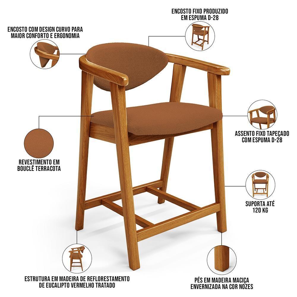 Kit 06 Banquetas Baixa Para Cozinha Sala Jantar Bancada Cecília L02 Bouclê Terracota - Lyam DecorCrie um ambiente sofisticado e acolhedor com o Kit 06 Banquetas Baixa Cecília, da Lyam Decor. Com design moderno essa banqueta é uma peça muito versátil, pois você pode aproveitá-la em diversos ambientes, desde cozinha, sala de jantar, bancada até a área gourmet ou bar e, assim, agregar o máximo de beleza e conforto. Afinal, essa banqueta de madeira se destaca pela sua estrutura robusta que resistência e durabilidade. Já o assento estofado oferece o máximo conforto, enquanto o encosto proporciona suporte ergonômico sem igual. Combinando elegância e praticidade, essa banqueta baixa com encosto é perfeita para quem deseja um toque de requinte em qualquer ambiente. Adicione um charme especial ao seu lar com essa peça indispensável. Adicione ao seu carrinho e desfrute momentos de alegria com a Banqueta Cecília!Dimensões da Banqueta (L x A x P) 51 x 90 x 47 cmMedidas Internas: Altura do chão ao assento: 60 cm Assento livre (L x A x P): 44 x 4,5 x 46,5 cm Encosto livre (L x A): 41 x 22 cm Altura total do encosto: 33 cm Altura interna do braço: 18 cm Altura do chão ao início do braço: 76 cm Altura do chão ao apoio de pés: 17 cm Largura interna do apoio de pés: 27 cm Altura do apoio de pés: 4,5 cmCaracterísticas: Estrutura em madeira de reflorestamento de eucalipto vermelho tratado. Revestimento em tecido Bouclê de alta qualidade na cor Terracota. Assento e encosto fixos tapeçados com espuma D-28. Encosto com design curvo para maior conforto e ergonomia. Pés em madeira maciça envernizada na cor Nozes. Peso suportado: Até 120 kg.- Nunca sentar nos braços ou encosto do produto. - Por se tratar de estofado as medidas podem ter uma pequena variação de até 3 cm. - A tonalidade do produto real poderá ter ligeira variação devido o lote de tecidos. - Indicado para uso residencial, sua limpeza deve ser feita com pano levemente umedecido em água limpa, sem esfregar, não utilizar produtos abrasivos, desengordurantes, álcool ou solvente.Observações importantes: - Produto para uso residencial em ambiente interno, não devendo ficar exposto diretamente ao sol, calor e umidade excessivos. - Pode haver alguma diferença de tonalidade entre a imagem e o produto real, por conta do tratamento de imagens e a calibração de cores do seu monitor. - As imagens são meramente ilustrativas, não acompanham objetos de decoração e eletrônicos. - Ao receber a mercadoria, o cliente deve verificar as condições da embalagem, caso haja alguma não assine o de e com nossa para orientações. - Montagem, desmontagem e outras instalações serão de responsabilidade do cliente. Não nos responsabilizamos, no ato da , por subir escadas/elevadores ou pelo por guincho em apartamentos. Eventuais despesas são de responsabilidade do comprador. - Confira as dimensões do produto e certifique-se de que passará normalmente por supostos elevadores, portas, escadas e/ou corredores de sua residência. - Para mais informações, acesse nossa Central de . Com apoio de braços: Sim