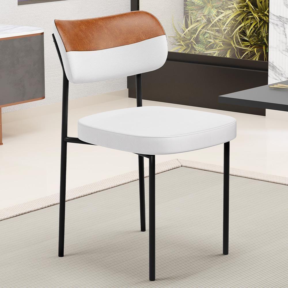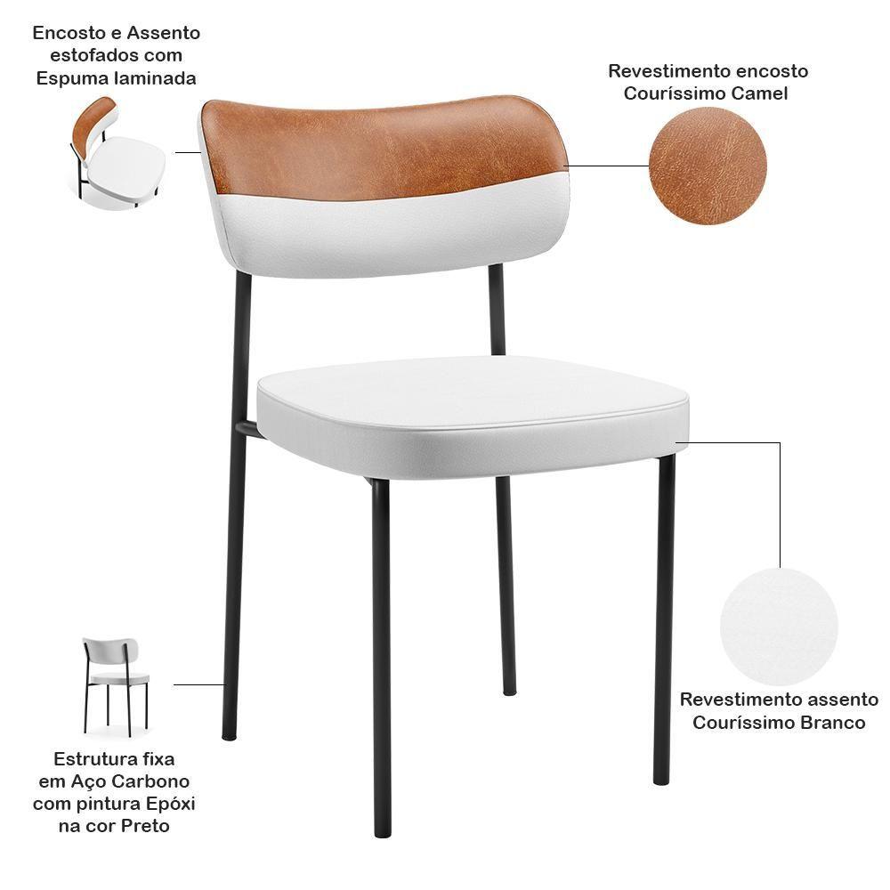 Kit 08 Cadeiras Decorativa Para Sala De Jantar Melina L02 Faixa Couríssimo Camel Facto Branco - Lyam DecorCaso você esteja buscando conforto, realce e praticidade, o Kit 08 Cadeiras Estofadas Melina vai superar todas as suas expectativas. Garante muita comodidade e otimiza o espaço, além de harmonizar com seu estilo decorativo facilmente, podendo ser utilizada em salas de estar, jantar e cozinha, além de dar um toque especial em sua decoração. Sua proposta de design suavizará seu ambiente sem passar despercebida oferecendo mais leveza e receptividade ao seu lar. Estruturada em aço carbono, contrasta lindamente com o encosto e assento estofados que são extremamente confortáveis, resistentes e aconchegantes. Você merece esta incrível combinação em sua casa, adquira já a sua!Dimensões da Cadeira (L x A x P) 45 x 77 x 54 cmMedidas Internas: Altura do encosto: 22 cm Largura do encosto: 49 cm Altura do assento: 6,5 cm Largura do assento: 44 cm Profundidade do assento: 45 cm Altura do Assento ao chão: 49 cmCaracterísticas: Encosto e assento estofados com espuma laminada. Estrutura fixa em aço carbono com pintura epóxi na cor Preto. Revestimento em Couríssimo na cor Camel e Facto Branco. Suporta até 120 kg.- Por se tratar de estofado as medidas podem ter uma pequena variação de até 3 cm. - A tonalidade do produto real poderá ter ligeira variação devido o lote de tecidos. - A limpeza deve ser feita com pano levemente umedecido em água limpa, sem esfregar, não utilizar produtos abrasivos, desengordurantes, álcool ou solvente.Observações importantes: - Produto para uso residencial em ambiente interno, não devendo ficar exposto diretamente ao sol, calor e umidade excessivos. - Pode haver alguma diferença de tonalidade entre a imagem e o produto real, por conta do tratamento de imagens e a calibração de cores do seu monitor. - As imagens são meramente ilustrativas, não acompanham objetos de decoração e eletrônicos. - Ao receber a mercadoria, o cliente deve verificar as condições da embalagem, caso haja alguma não assine o de . - Montagem, desmontagem e outras instalações serão de responsabilidade do cliente. Não nos responsabilizamos, no ato da , por subir escadas/elevadores ou pelo por guincho em apartamentos. Eventuais despesas são de responsabilidade do comprador. - Confira as dimensões do produto e certifique-se de que passará normalmente por supostos elevadores, portas, escadas e/ou corredores de sua residência. cor: branco