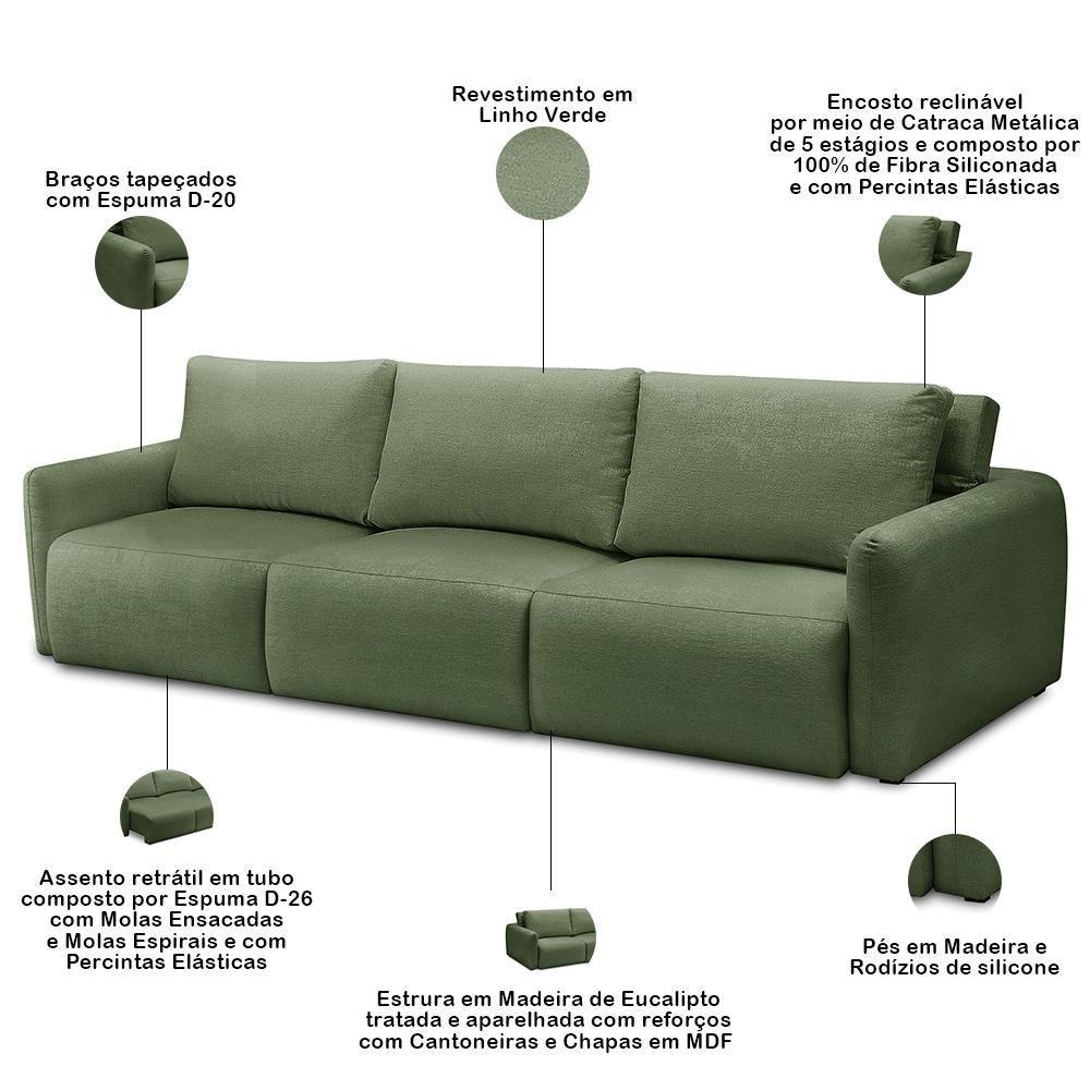 Sofá Retrátil Reclinável Para Sala 5 Lugares 345cm Egeu F04 Linho Verde - Lyam Decor