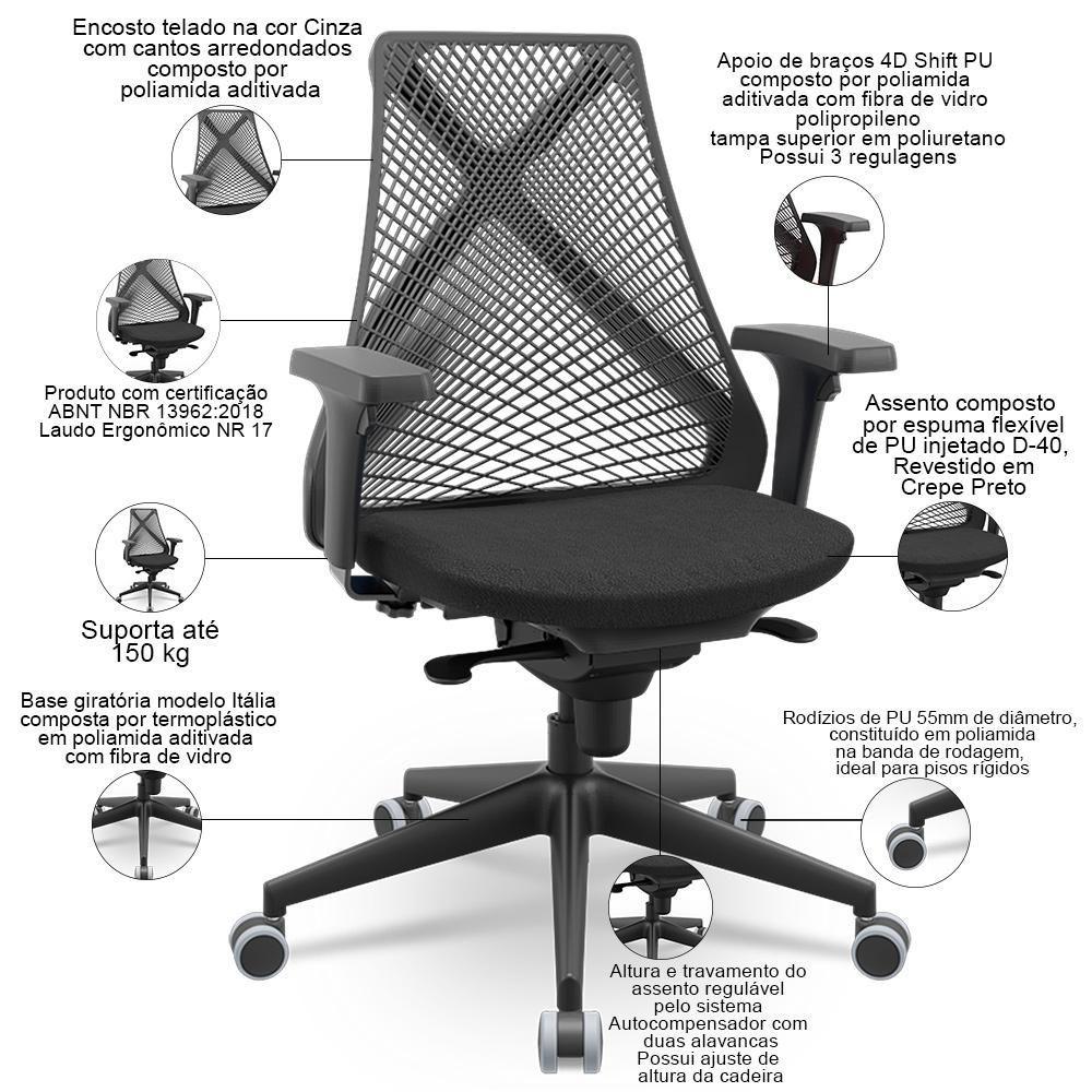 Kit 02 Cadeiras De Escritório Giratória Presidente Unix P03 Tela Cinza Crepe Preto - Lyam Decor